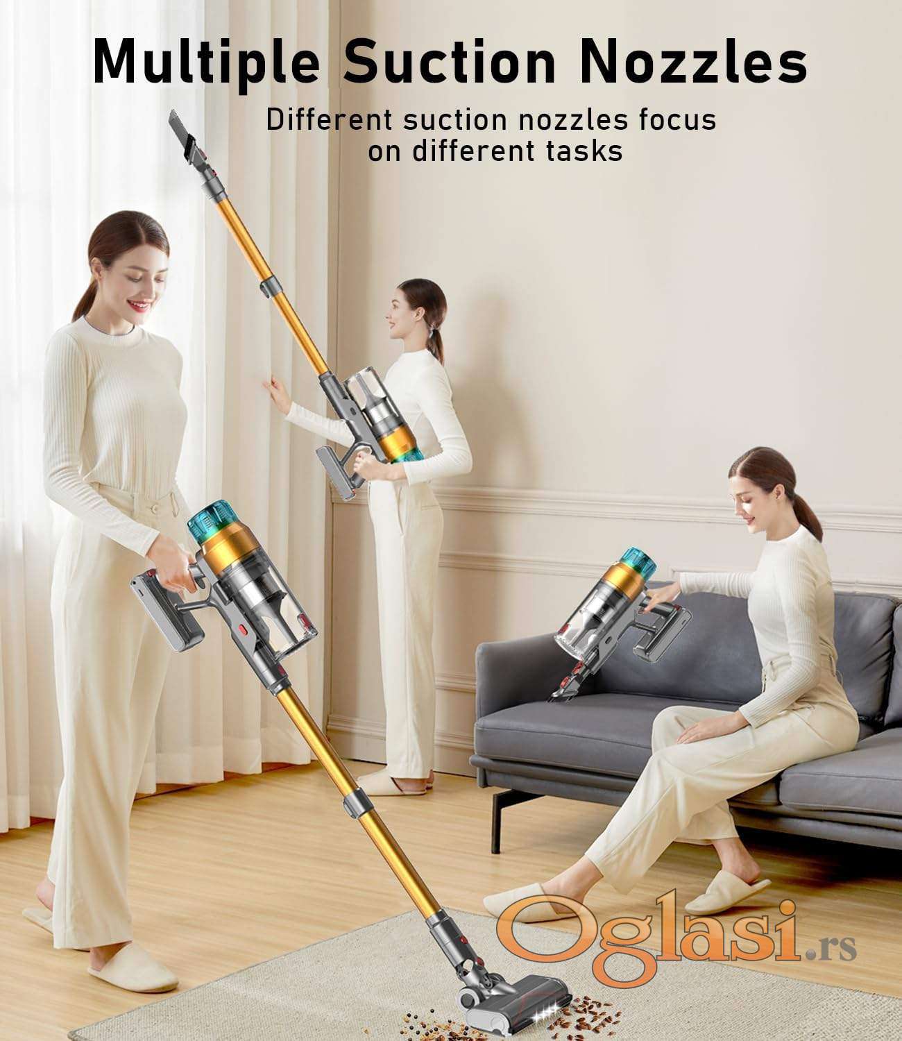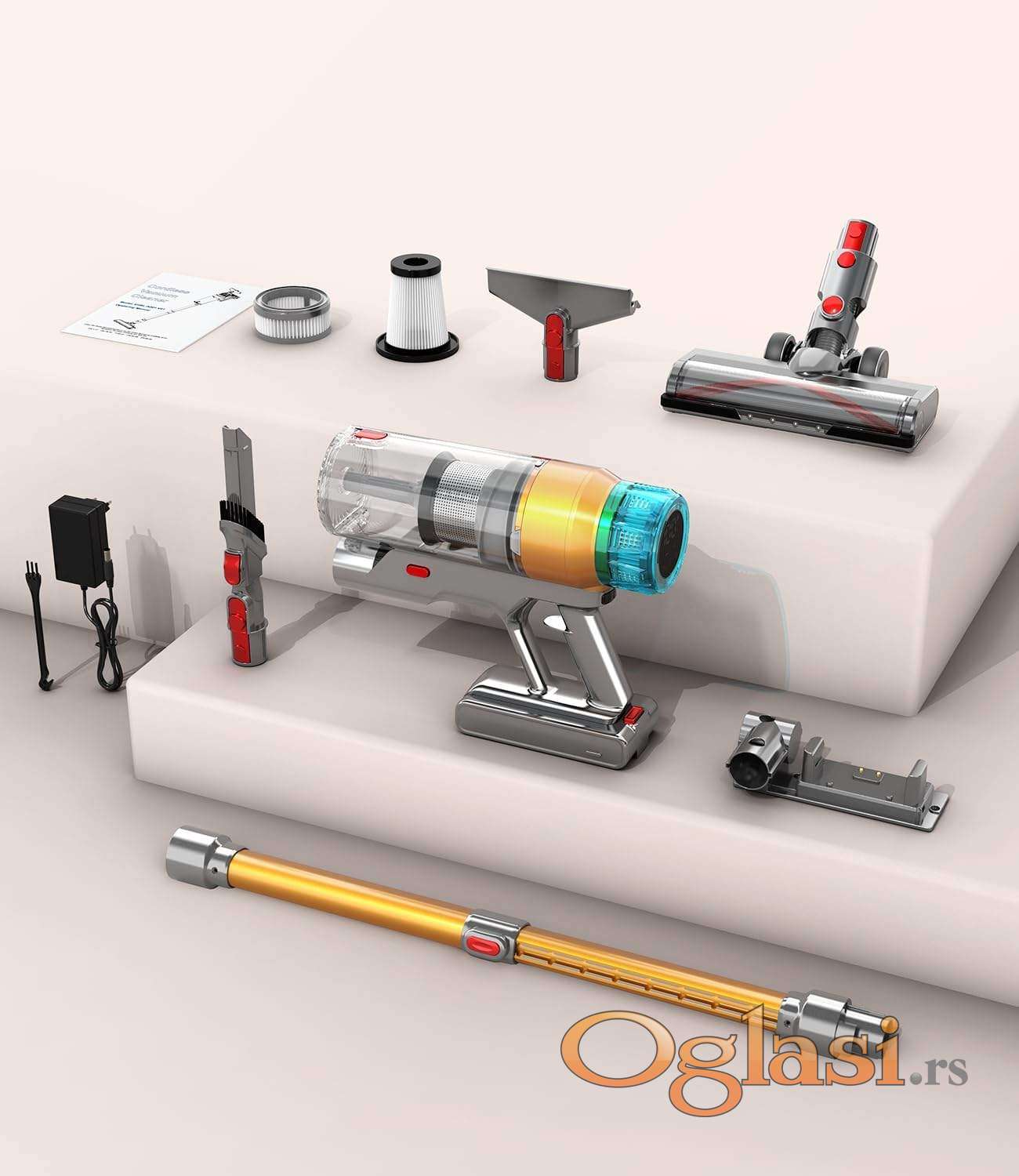 Uz usisivač dobijate bateriju, punjivu zidnu stanicu, adapter, 2 u 1 četku, mlaznicu za sofu, usku mlaznicu, rezervni HEPA filter, alat za čičćenje četke i mlaznica i uputstvo za upotrebu.