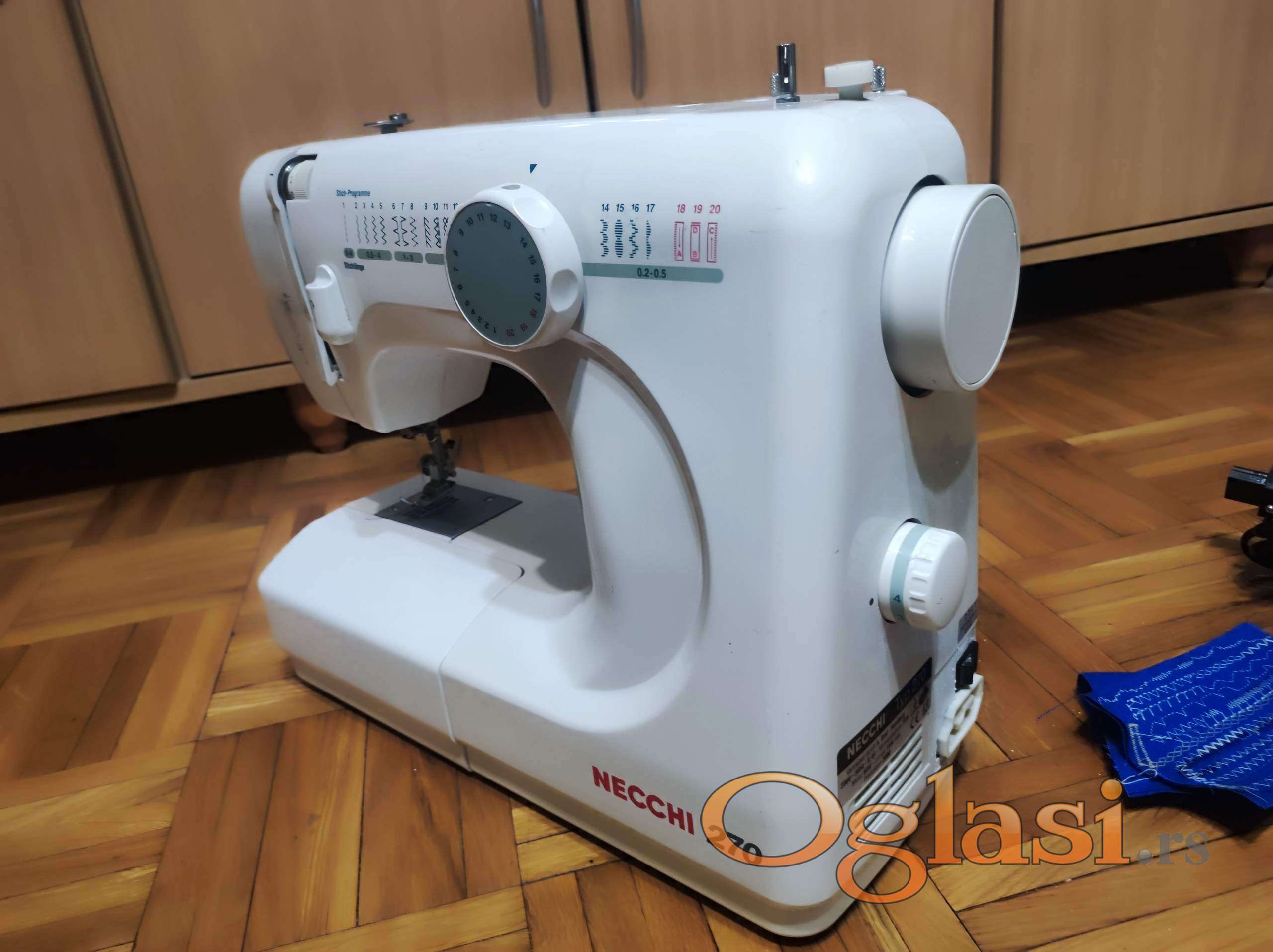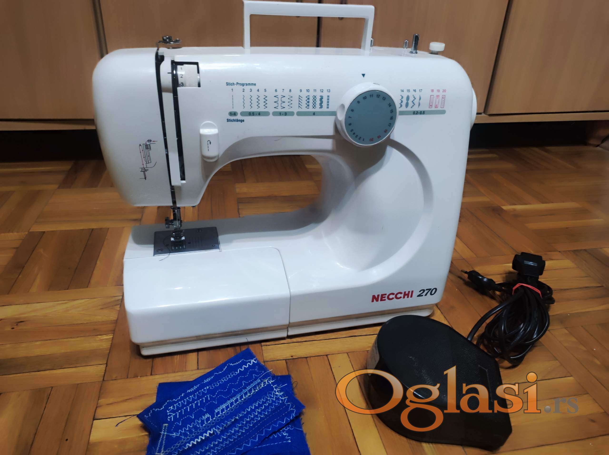 Povoljno prodajem korišćenu mašinu za šivenje marke NECCHI 270 u potpuno ispravnom stanju. Mašina može da pravi 14 različitih vezova čiji se bod može dodatno podešavati po dužini, a cik-cak i po širini, zatim ima mogućnosti opšivanja rupica za dugmiće, šivenja unazad, podešavanja pritiska stopice na materijal, mašinskog namotavanja konca na kalem i osvetljenja radne površine. Izgled vezova prikazan je na slici.