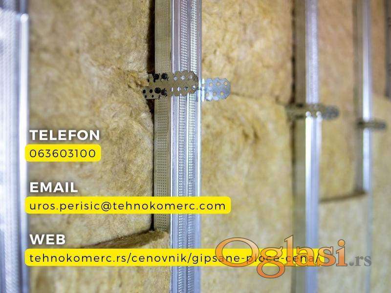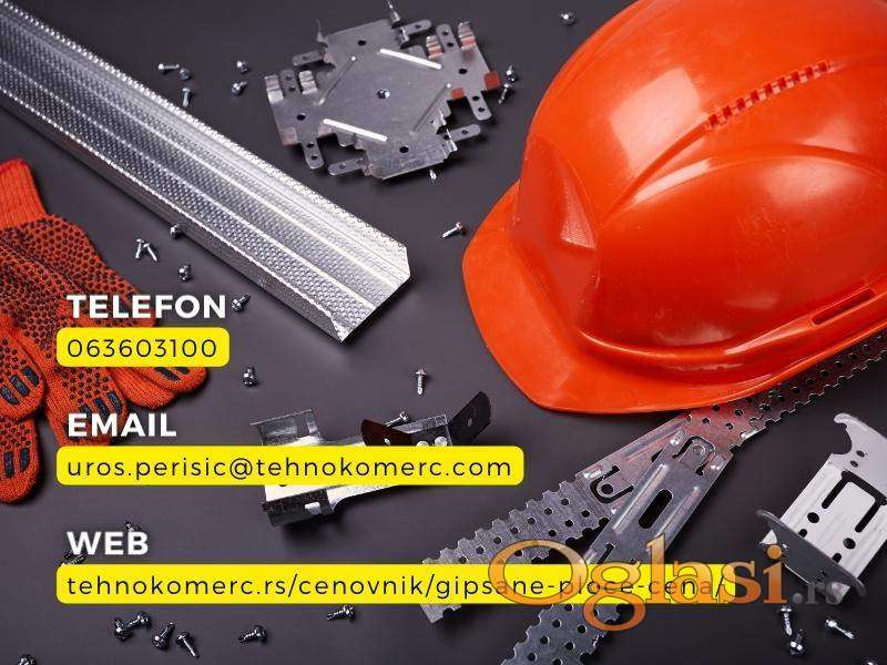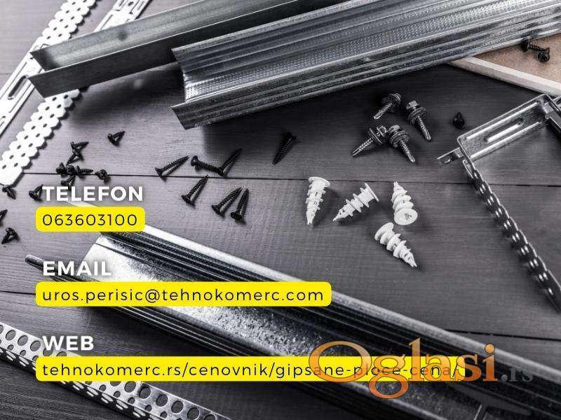 Standardne, vlagootporne i vatrootporne gips-kartonske ploče proizvođača Knauf i Technogips PRO. Metalni profili CD/UD (0.5 i 0.6 mm) i CW/UW (0.6 mm) u dužinama od 3 i 4 m.