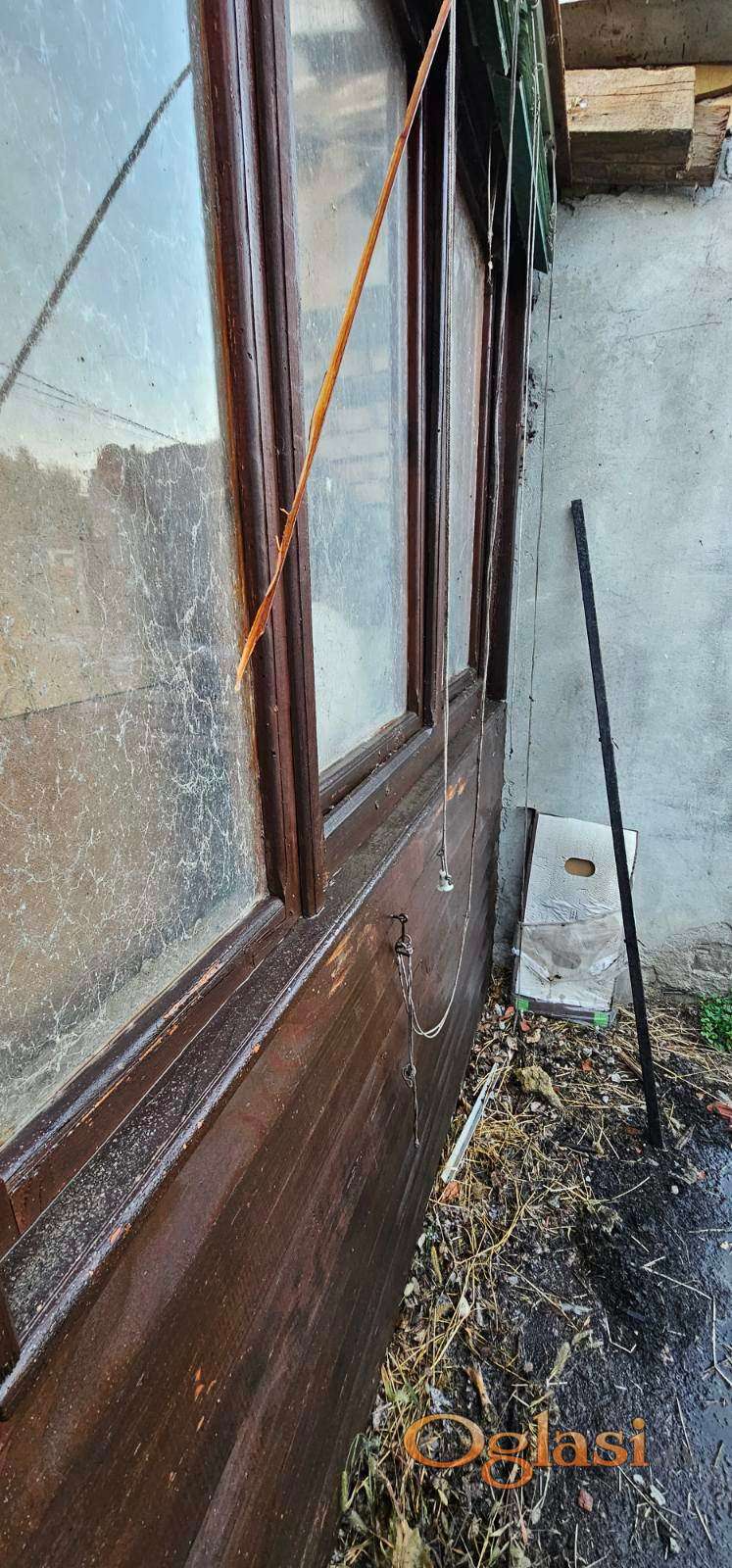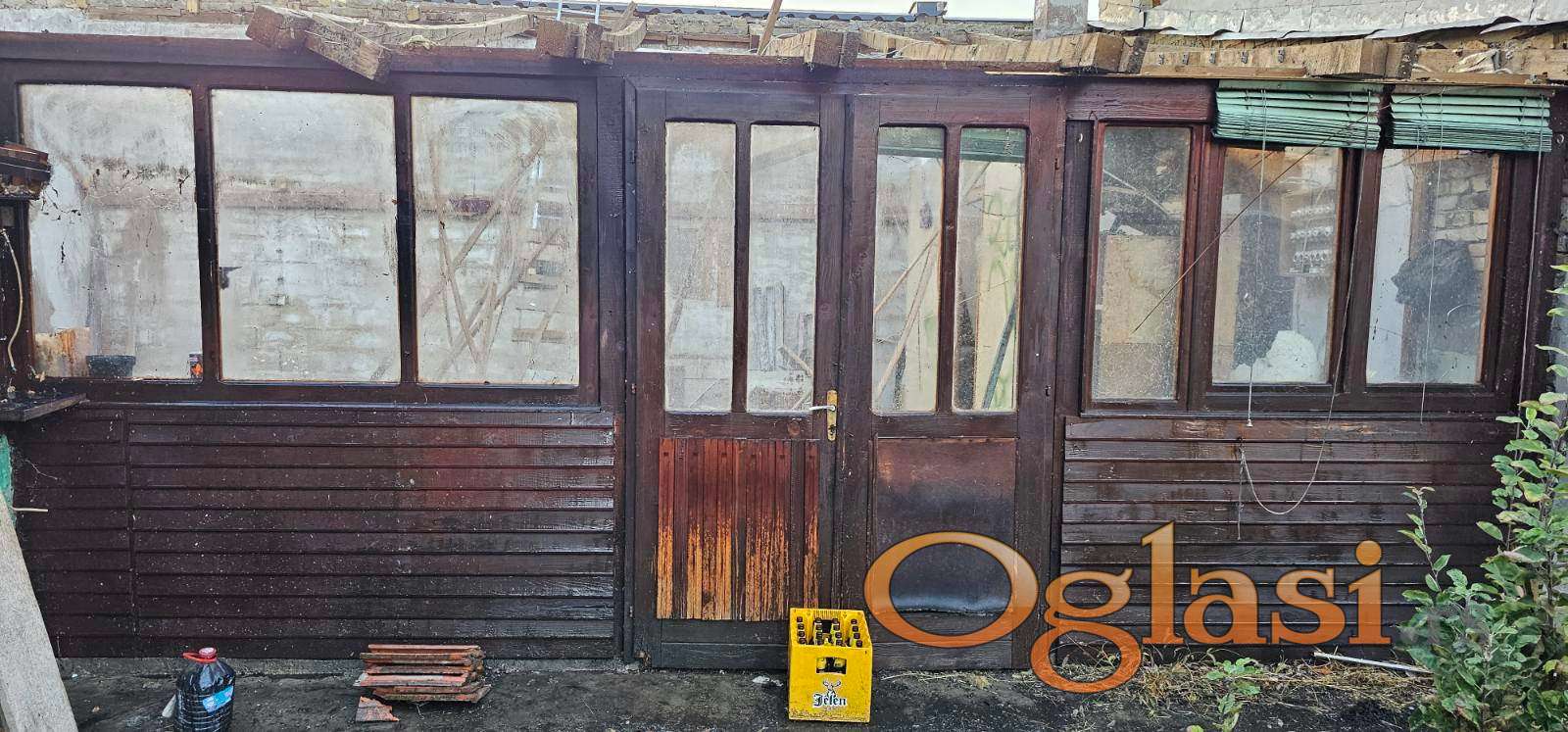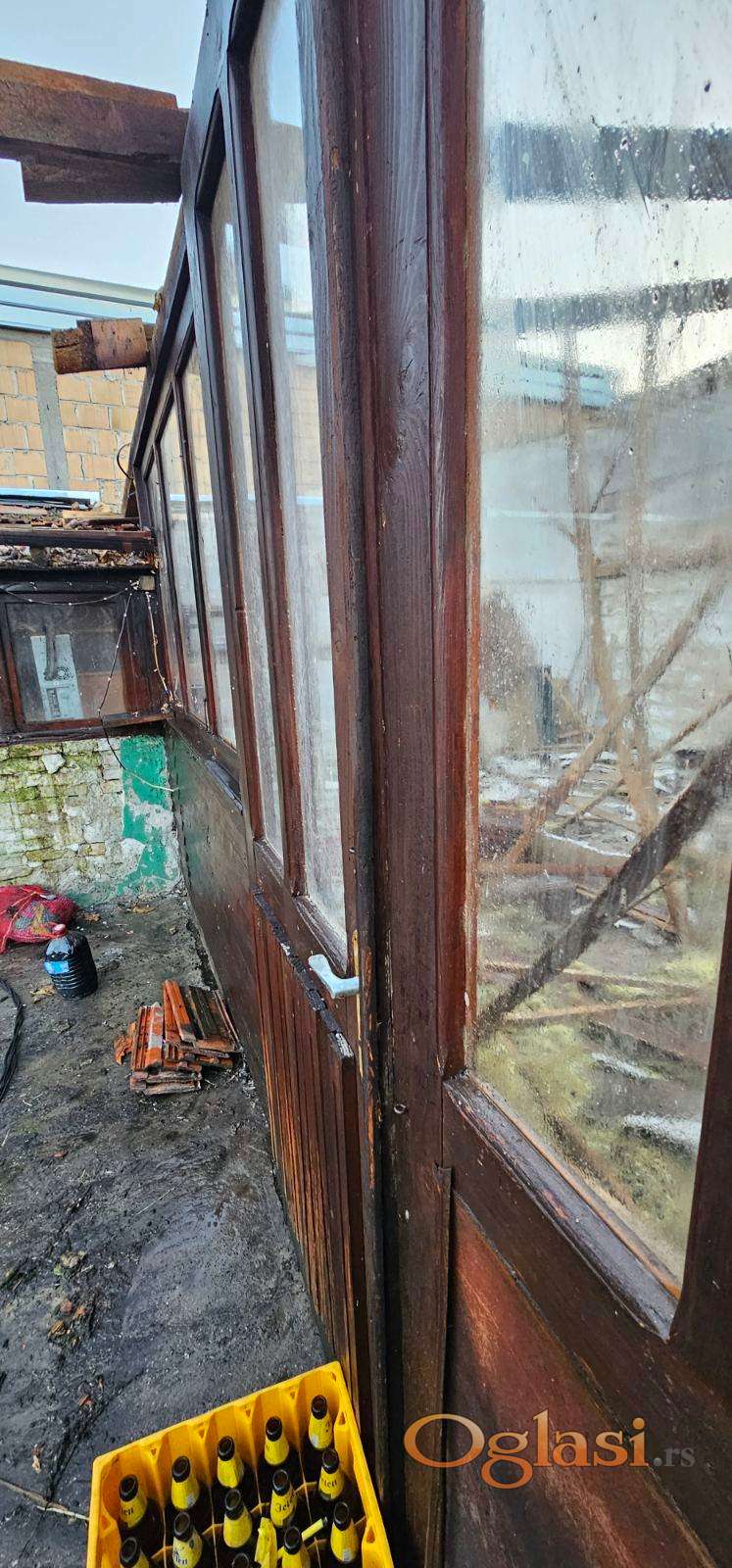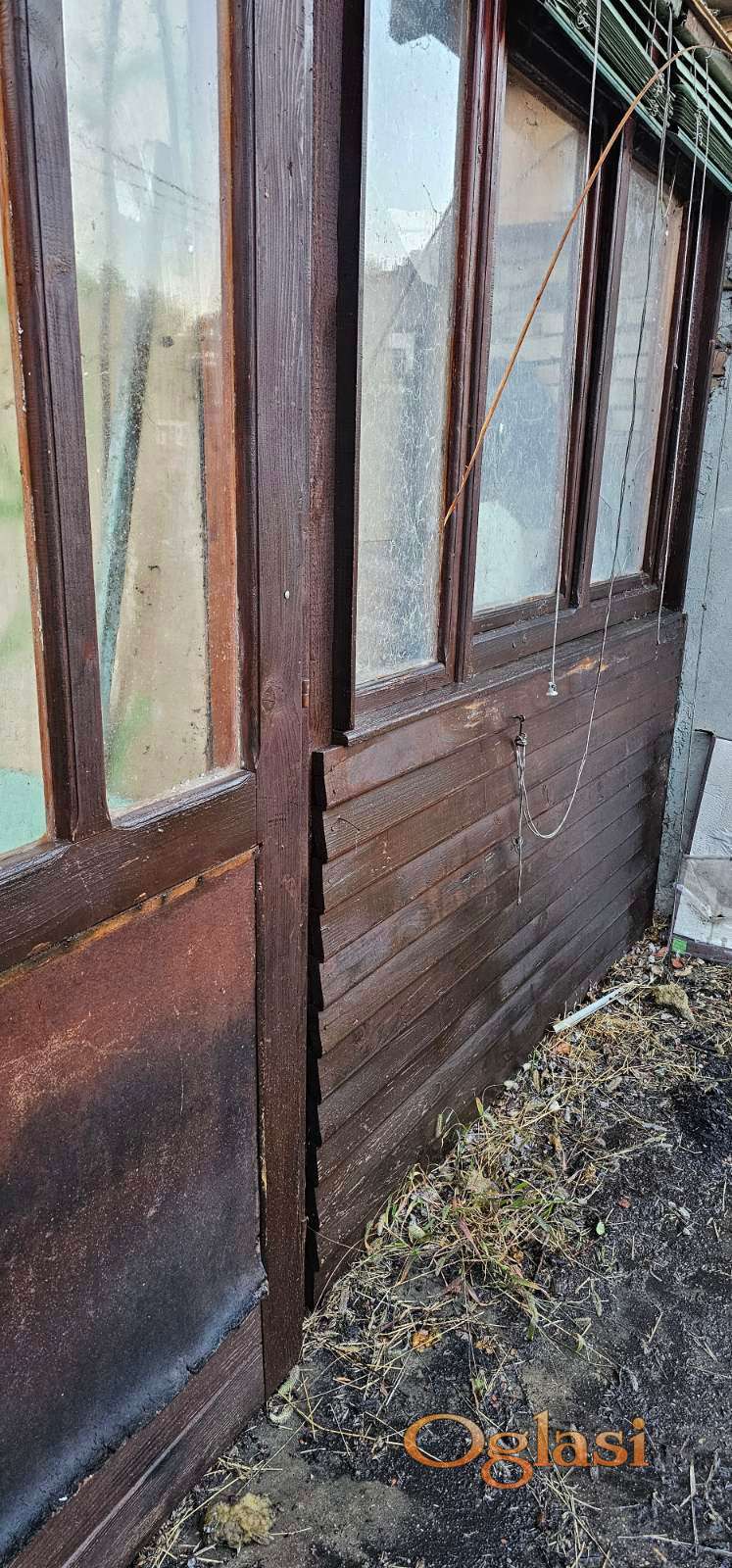 Prodaje se veliki drveni portal sa dvokrilnim vratima i osam prozora, izrađen od kvalitetnog punog drveta.