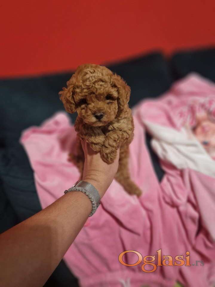 Toy pudle maleni mečići spremni za preuzimanje. Predivnih okruglih glavica, kratke njuske, malog rasta i sitne gradje. Oba roditelja u nasem vlasnistvu. Imamo bebe i u aprikot i u crvenoj boji. Od nas dobijate sve neophodno za dolazak vaseg novog clana u vas dom. Cinije za hranu i vodu, pelenice gde obavljaju nuzdu, hrana za prelazni period, omiljena igrackica malisana. Vase je da ih volite i ovaj oglas nije za nakupce. Samo za ozbiljne ljubitelje zivotinja i predivnih pudli. Moguca je i dostava uz dogovor.