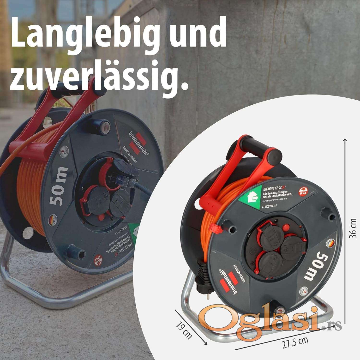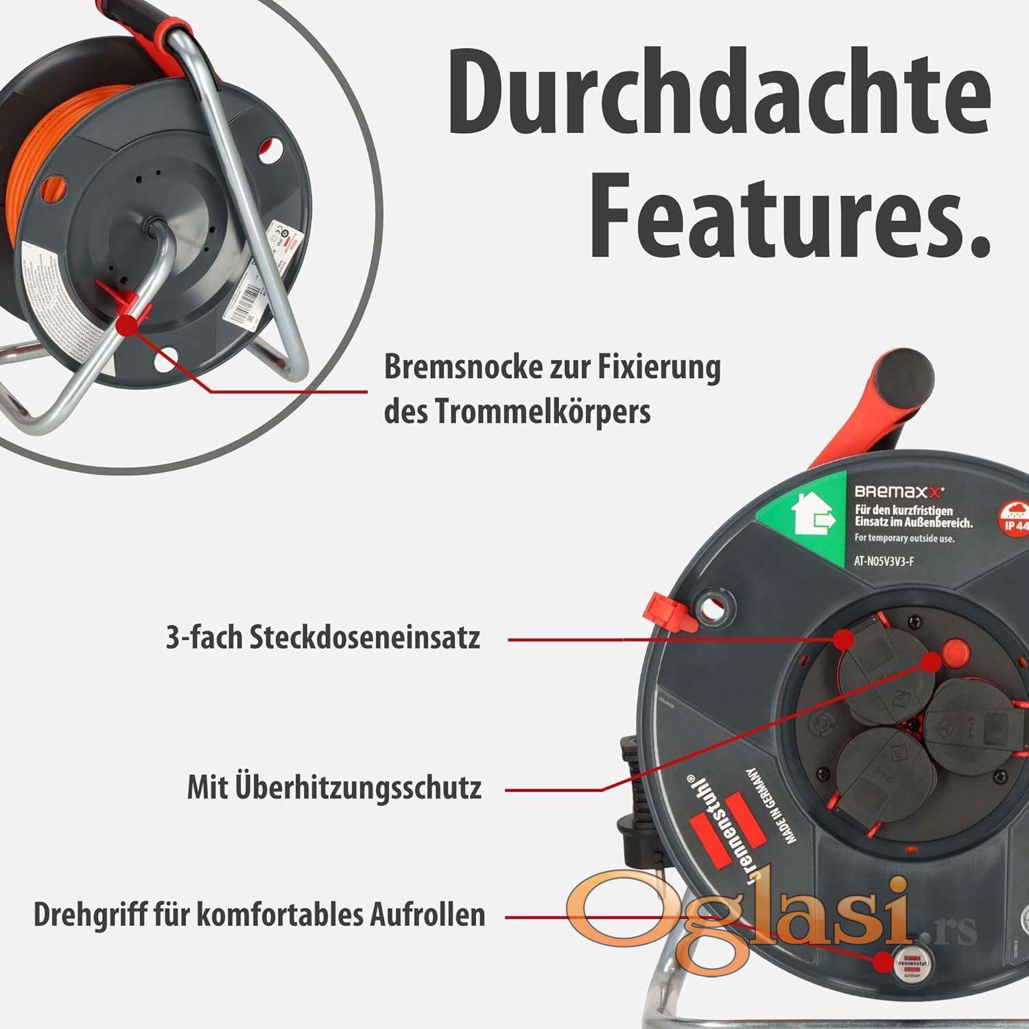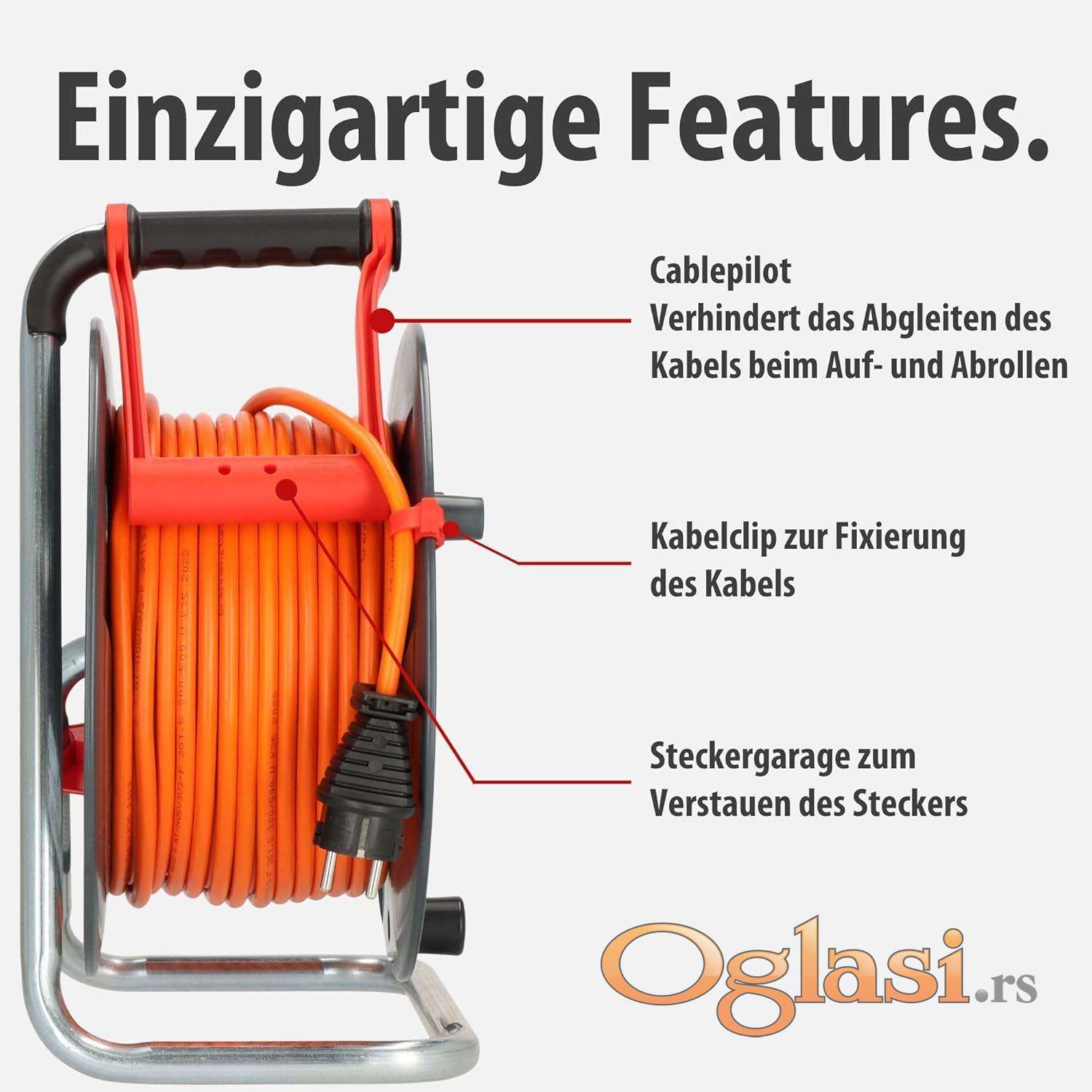 Spoljašnji kablovski kalem sa 3 utičnice sa kontaktom za uzemljenje, otporan na prskanje vodom IP44, sa samozatvarajućim poklopcima Inovativna ručka za nošenje „cablepilot“ obezbeđuje odgovarajuće vođenje kabla i sprečava klizanje kabla prilikom motanja gore-dole, obezbeđuje slobodne ruke tokom transporta i praktično kačenje
