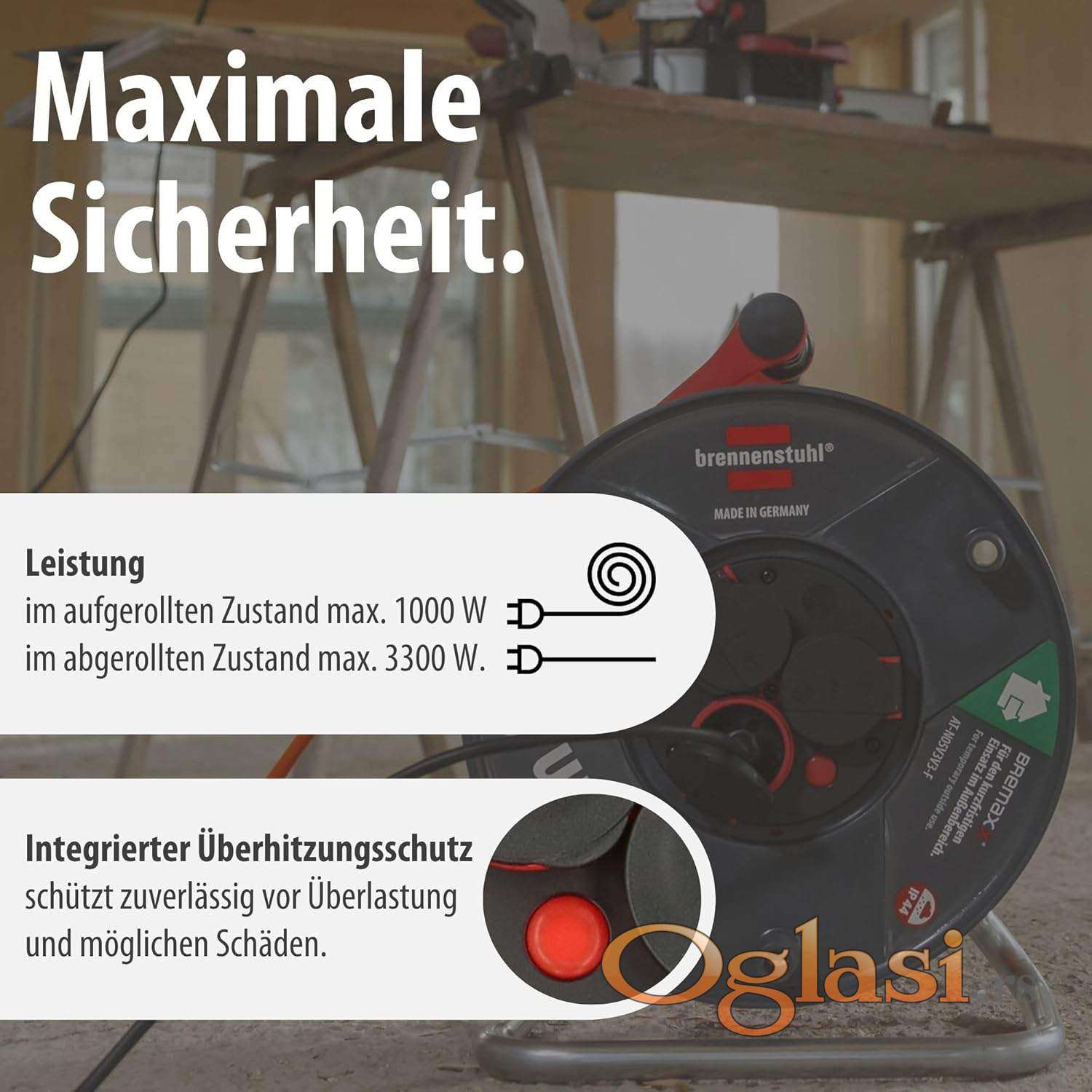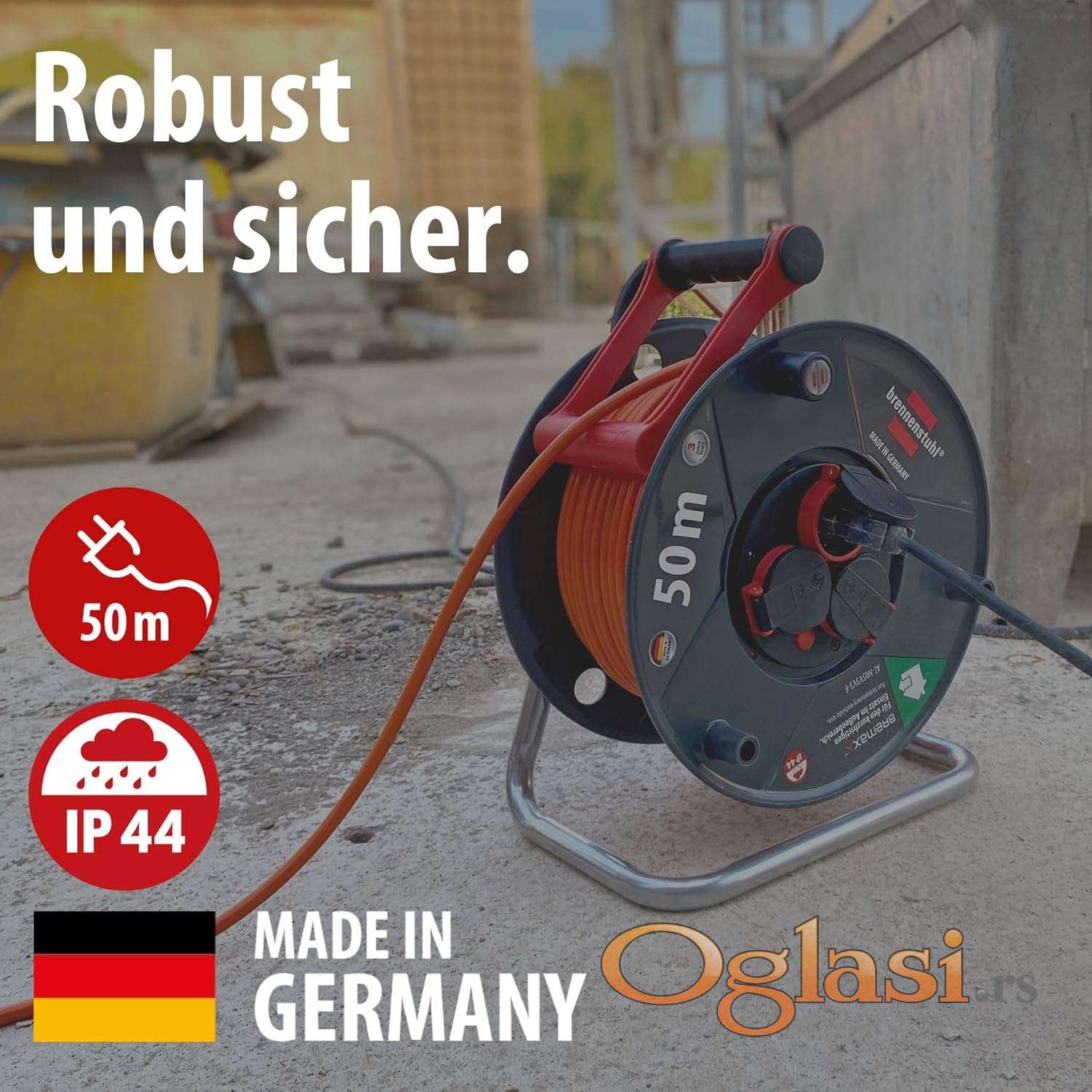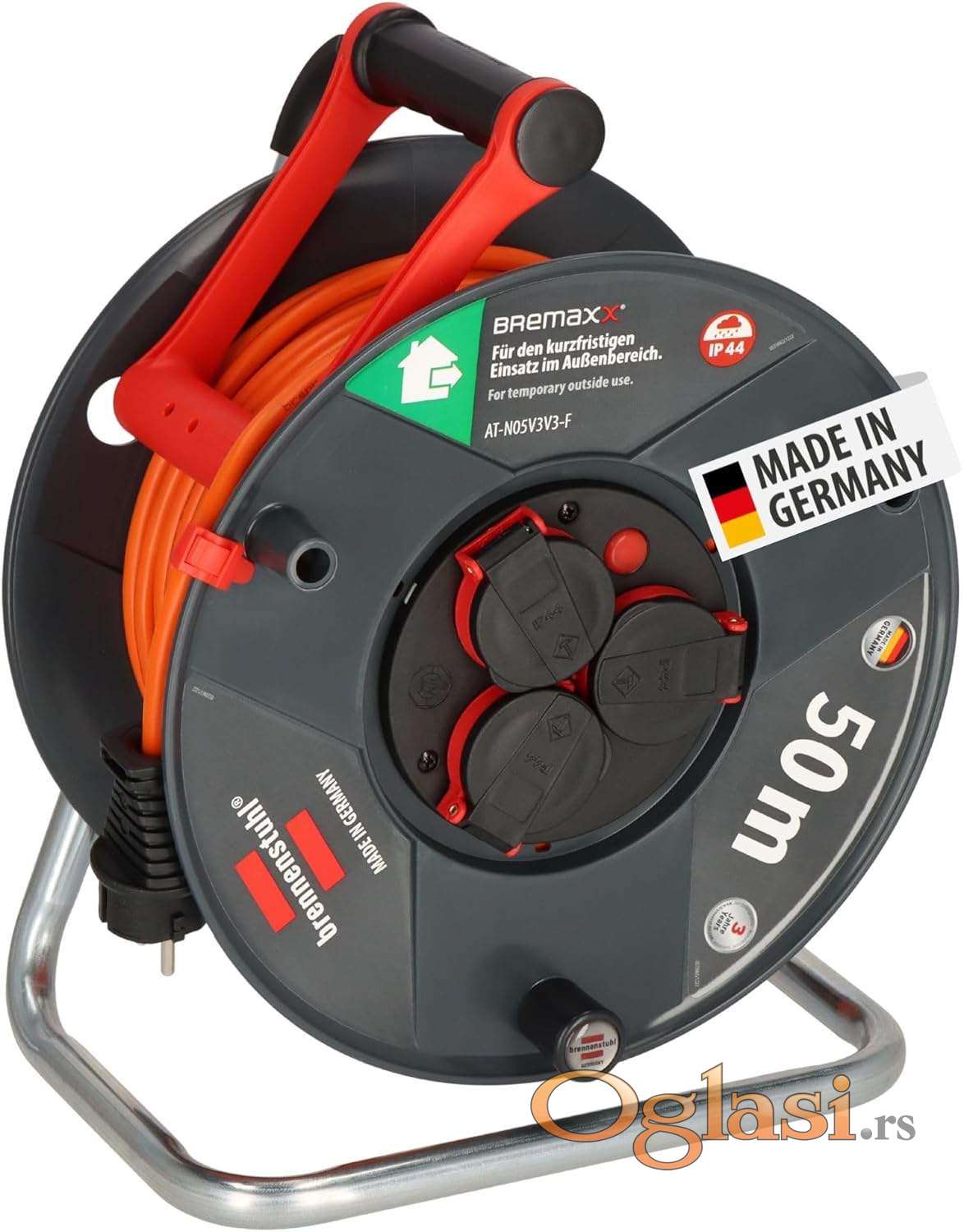 Spoljašnji kablovski kalem sa 3 utičnice sa kontaktom za uzemljenje, otporan na prskanje vodom IP44, sa samozatvarajućim poklopcima Inovativna ručka za nošenje „cablepilot“ obezbeđuje odgovarajuće vođenje kabla i sprečava klizanje kabla prilikom motanja gore-dole, obezbeđuje slobodne ruke tokom transporta i praktično kačenje