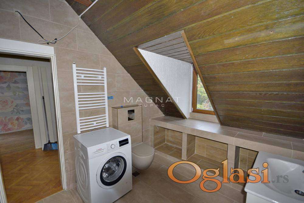 U najlepštem delu grada, u mirnoj i lepoj ulici nalazi se ova porodična kuća okružena zelenilom. Kuća ima predivno dvorište na kome se nalazi garnitura za sedenje, zidani roštilj na otvorenom, česma, basket tabla i dosta stabala koji ga okružuji. Dvorište je ograđeno, ima dva ulaza i jedna električna vrata za ulazak u garažu. Postoji pomoćni objekat koji se nastavlja na garažu i može biti višenamenski. Kuća je po strukturi četvorosobna, u donjem nivou ima prostran dnevni boravak, komfornu kuhinju sa trpezarijom koja ima izlaz na pokrivenu baštu, kupatilo i hodnik. U gornjem nivou ima tri spavaće sobe, gardarober, terasu i kupatilo. Postoji mogućnost dodatne opremljenosti, trenutno je polunameštena. Ova šarmantna kuća je idealna za porodice, nalazi se u blizini svih ustanova i objekata neophodnih za udoban gradski život, a potpuno izolovana od buke i gužve. Odiše mirom i sigurnošću. Za svaku preporuku! 7510 Oznaka na mapi pokazuje deo grada, ne i tačan položaj zgrade. Agencijska provizija 2% 50%
