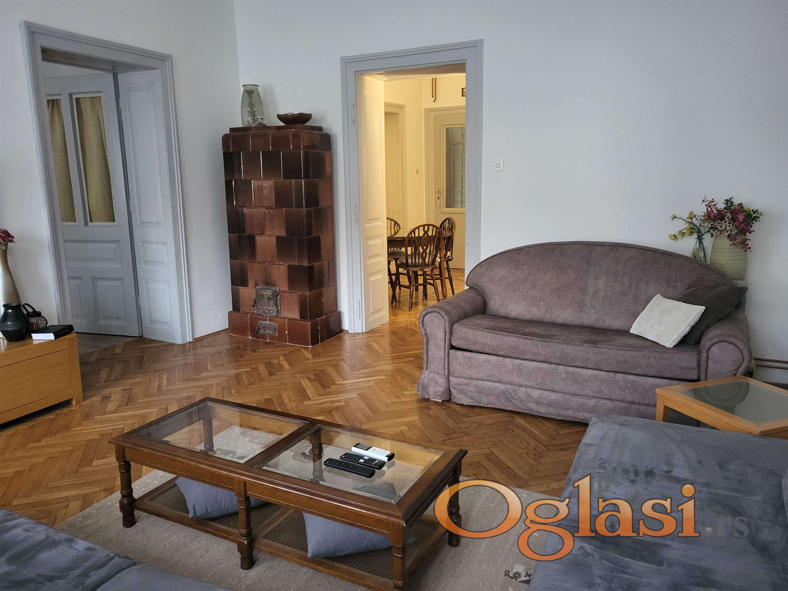 U dnevnoj sobi se nalazi velika ugaona garnitura koja, kad se razvuče, može poslužiti da jos dve osobe spavaju na njoj.