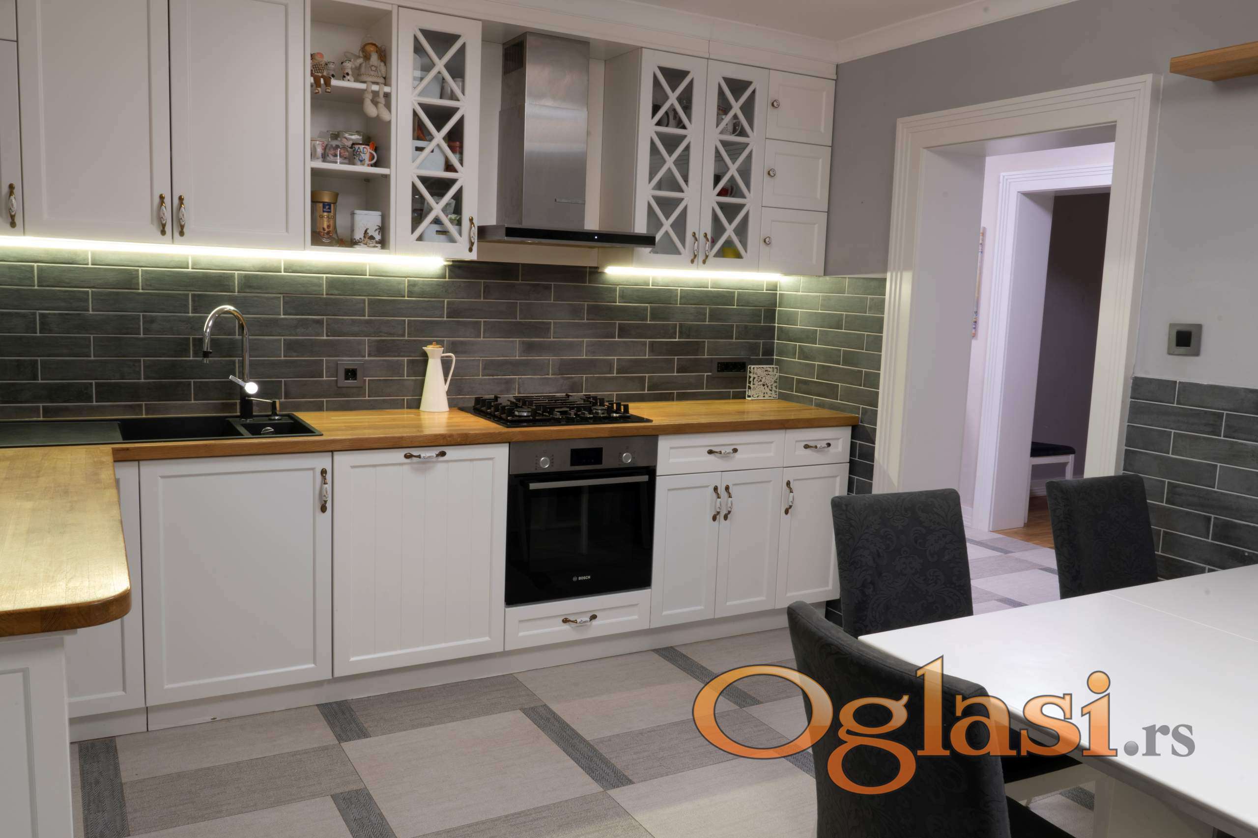 Kuhinja po meri kombinacija punog drveta i mat medijapana sa ugradnim Bosh uređajima
