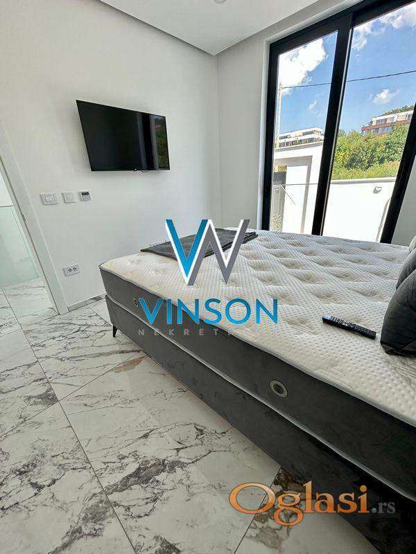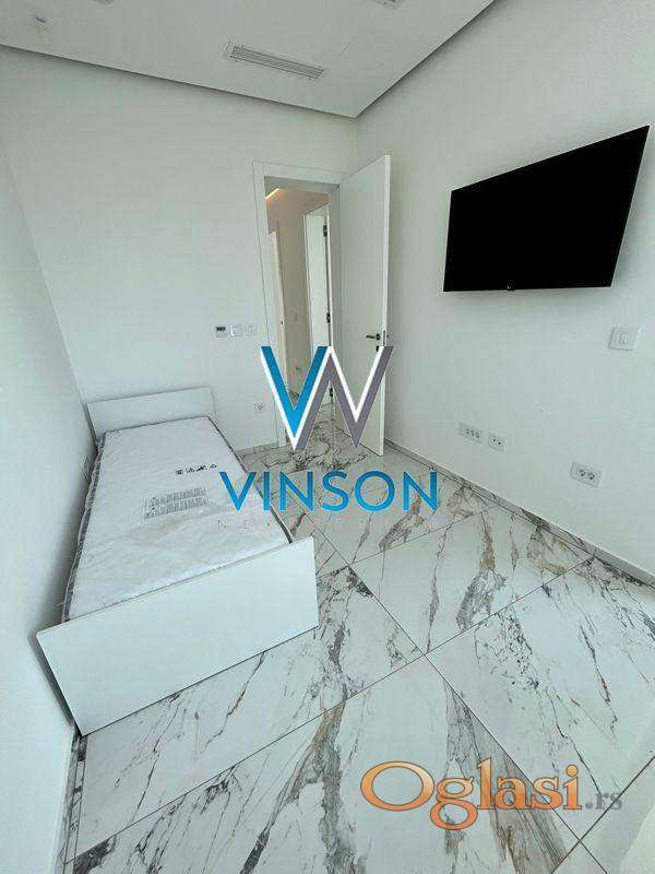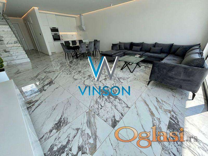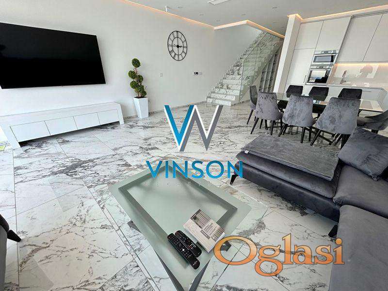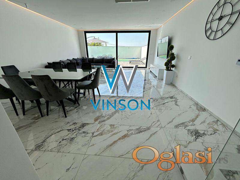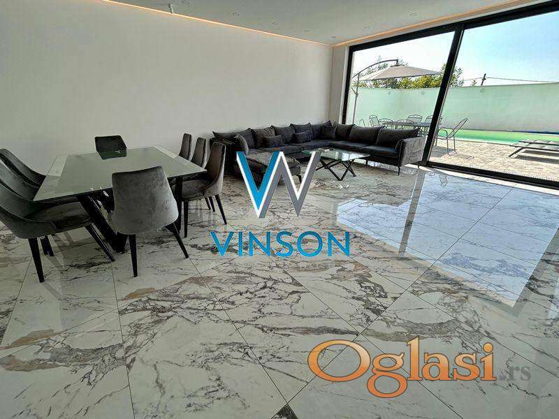 Sremska Kamenica. Izdvajamo iz ponude luksuznu nekretninu jedinstvenih karakteristika i visokog kvaliteta opreme i gradnje. Četvorosobna, kompletno nameštena kuća. Ovaj stambeni prostor, građen po principu smarthome sistema, poseduje dve etaže. Prvu etažu predstavlja lep i svetao dnevni boravak sa trpezarijom, uvučena kuhinja i kupatilo sa tuš kabinom. Iz dnevnog boravka se izlazi na prostranu terasu i dvorište sa bazenom. Druga etaža je rezervisana za spavaću zonu i nju čine tri spavaće sobe i kupatilo sa tuš kabinom. Na krovu se nalazi terasa, koji se moze pretvoriti u letnji djardino sa pogledom na grad. Trenutno je na istoj postavljen behaton. Podno grejanje u celoj kući i split sistem u svakoj prostoriji (grejanje i hlađenje). Video nadzor i alarm. Useljiva odmah. (Vinson nekretnine, Novi Sad, Reg. br. posrednika: 1085)