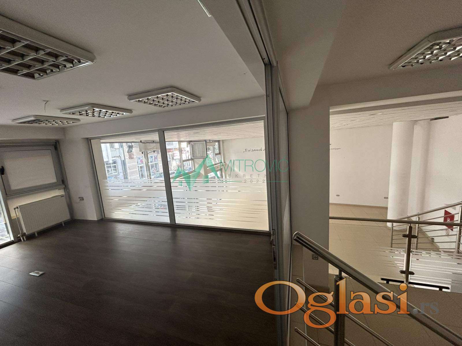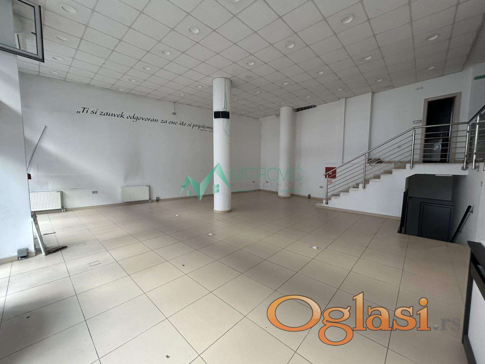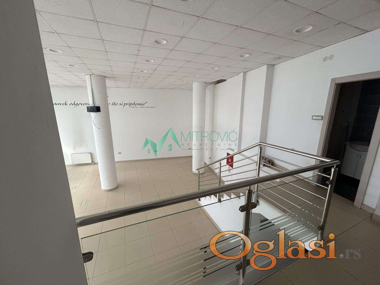 Poslovni prostor sastoji se od ulaznog dela, galerije - sa kancelarijom, dva toaleta hodnikom i čajnom kuhinjom, prostranog suterena za koji postoji i poseban ulaz kroz garažu. Grejanje je gradsko, ima tri inverter klima uređaja, dva ulaza i moguć je zakup dva parking mesta direktno ispred lokala. Udaljenost od škole 130 m. Za sve informacije pozvati 0600601204