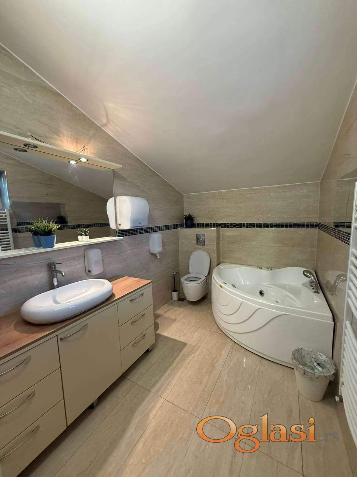 Izdaje se spratna kuca od 243m², povrsina placa 537m². U prizemlju se nalaze: opremljena kuhinja, velika prostorija (dnevna soba), 2 sobe, 2 kupatila i ostava, a na spratu jos 3 sobe i 1 kupatilo. Na placu se takodje nalaze i 4 garaze, pomocna prostorija i bazen. (Pomocna prostorija se trenutno ne izdaje, ali se za potrebe zakupca takodje moze urediti). 3 garaze su funkcionalne za parkiranje, cetvrta je namenjena za odlaganje stvari, dosta prostora za parkiranje u dvoristu, plus par mesta ispred kuce. Grejanje kombinacija toplotnih pumpi i gasa. Video nadzor, alarm. Kuca se izdaje bez kancelarijskog namestaja.