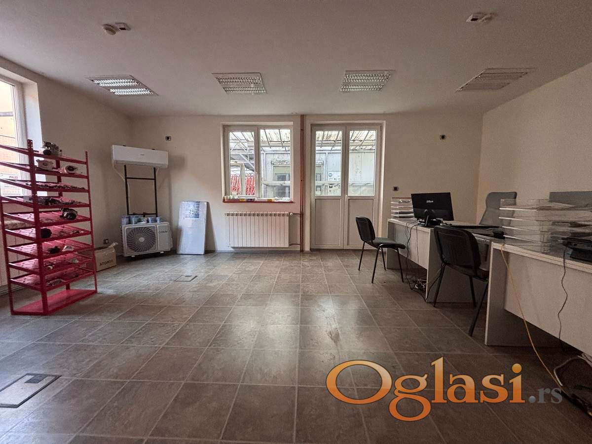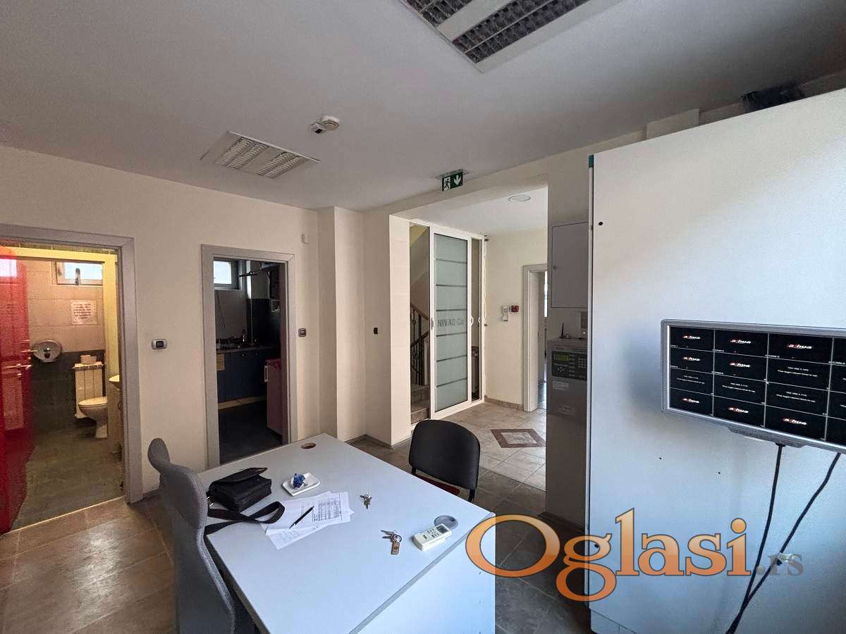 Glavni objekat se sastoji od tri etaže po 120m2. U podrumu, idealnim za korišćenje za magacinski prostor, nalazi se kotao na naftu, lift za dopremu robe direktno do prizemlja i jedno kupatilo. Prizemlje obuhvata prijemni deo, dve velike prostorije pogodne za kancelarije ili operativne timove, tri kupatila i čajnu kuhinju. Na prvom spratu, do kog vode unutrašnje stepenice, nalazi se terasa i po jedna velika prostorija sa leve i desne strane, sa pripadajućim kupatilom, pogodna za kancelarije ili dodatni skladišni prostor. U svim prostorijama je planirana ugradnja klima uređaja, a objekat je uredan i spreman za opremanje prema potrebama zakupca.