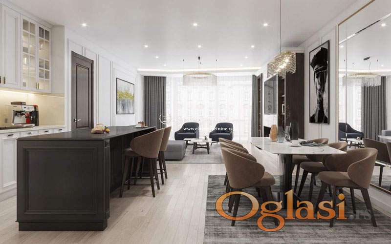 Ukoliko ste ljubitelj hedonizma i komfora, preporučujemo Vam luksuzan četvorosoban stan površine 135m2. Sastoji se od dnevnog boravka povezanog sa trpezarijom i kuhinjom, 3 spavaće sobe, 2 kupatila , toaleta i terase. Svaki od stanova je opremljen smart house sistemom, što znači da putem mobilnog telefona možete regulisati i upravljati različitim funkcijama u stanu.