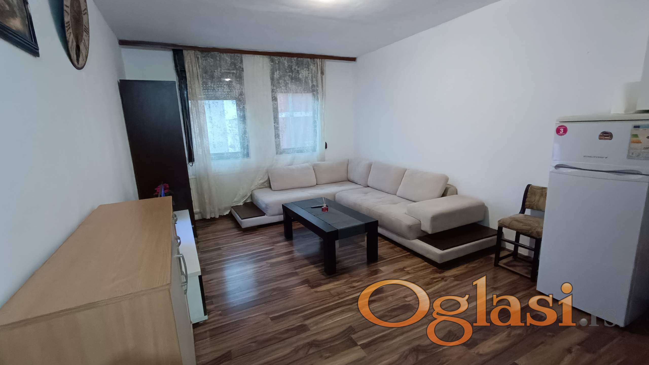 Nameštena: ugaona garnitura bez razvlačenja, led TV, veš mašina, kombinovani frižider,šporet,centralno grejanje.