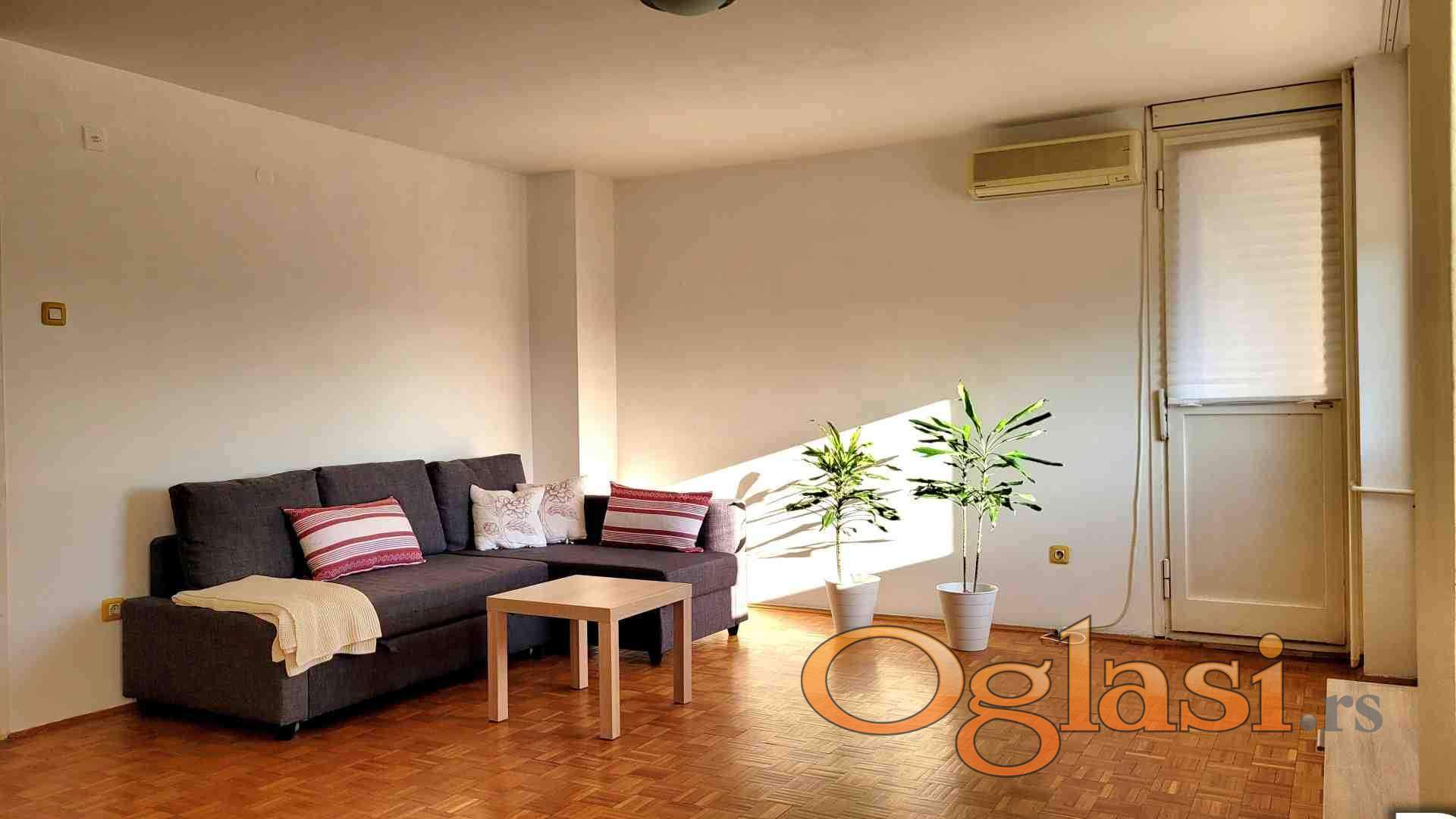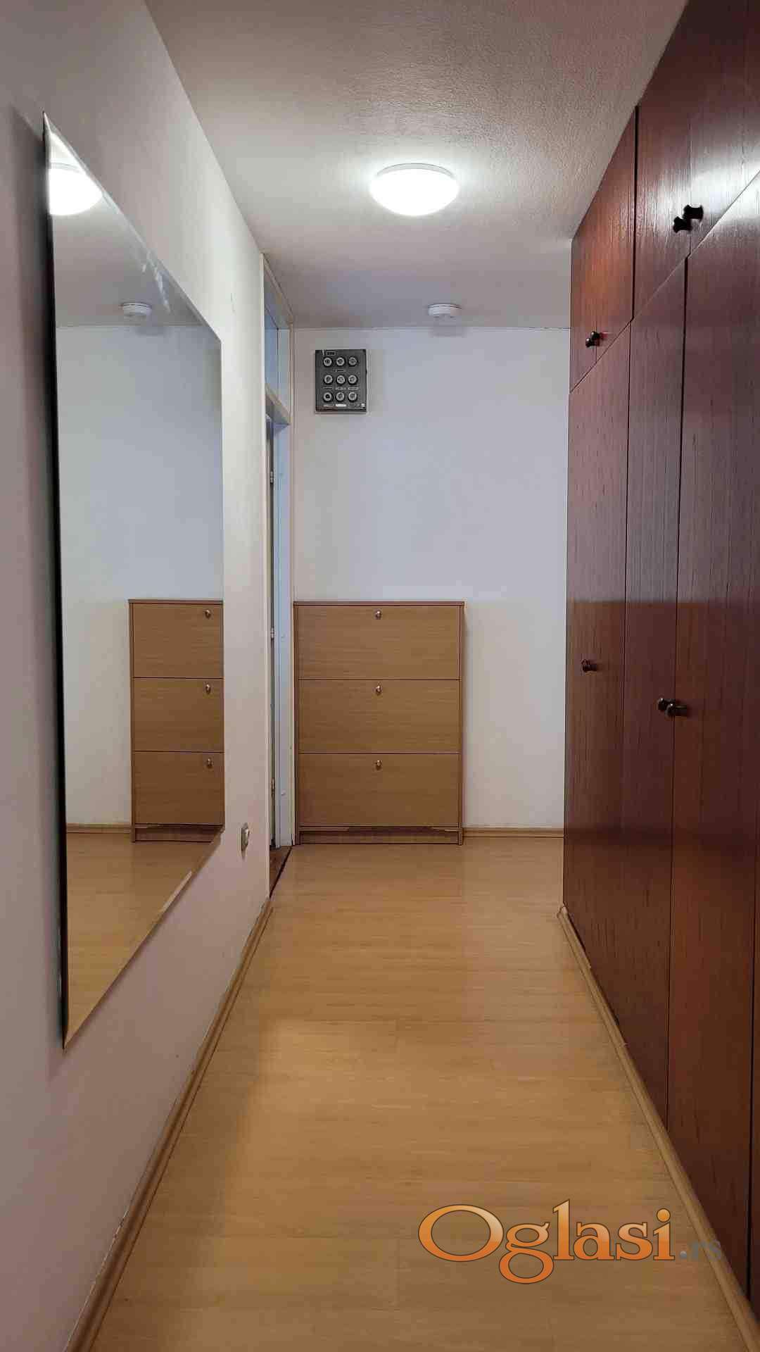 Namesten dvoiposoban stan od 54 kvadrata sa pogledom na zelene povrsine, osnovnu skolu, vrtic i jaslice. Suncan, svetao i okrenut prema dvorisnoj strani bloka. Struktura stana:dnevna soba,kuhinja,trpezarija,spavaća soba,kupatilo,terasa,hodnik i prolazna prostorija izmedju kupatila i spavace sobe, koja se moze koristiti kao prostor za radni sto, krevetac ili dodatni prostor sa odlaganje stvari.