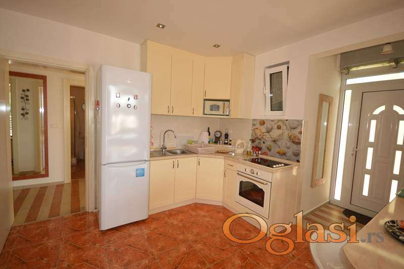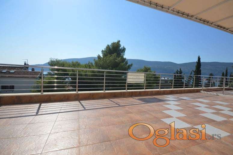 Raspored prostorija: ulazni hodnik, tri kupatila, dvije spavace sobe, dnevni boravak, kuhinja sa trpezarijom, pomocna prostorija, velika terasa ka moru juzna osuncana, mala terasa istok. Cijena : 700€