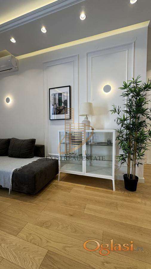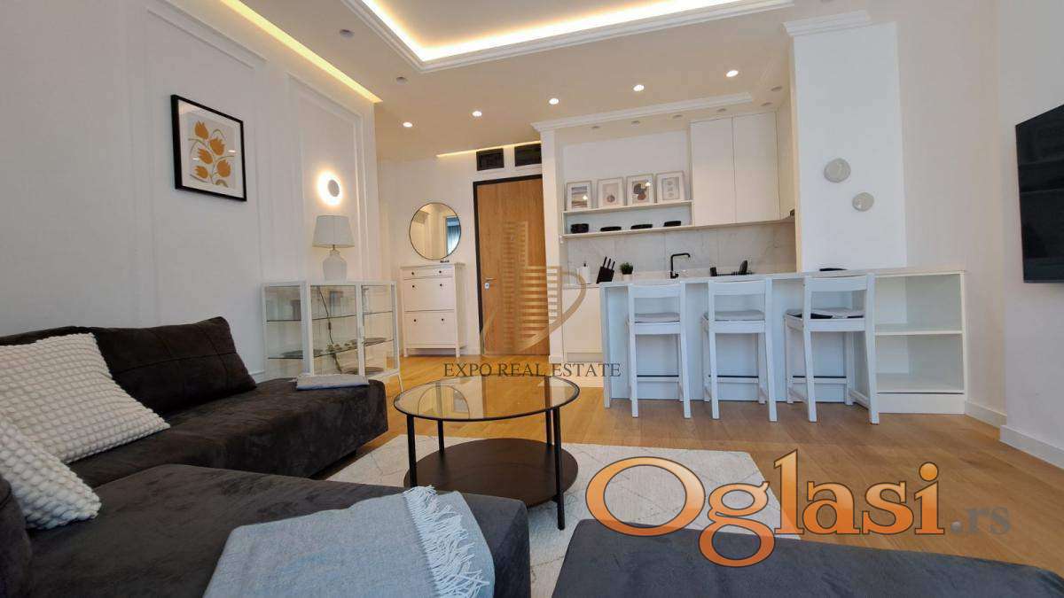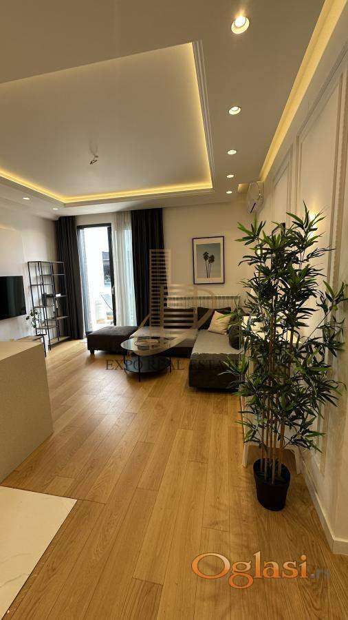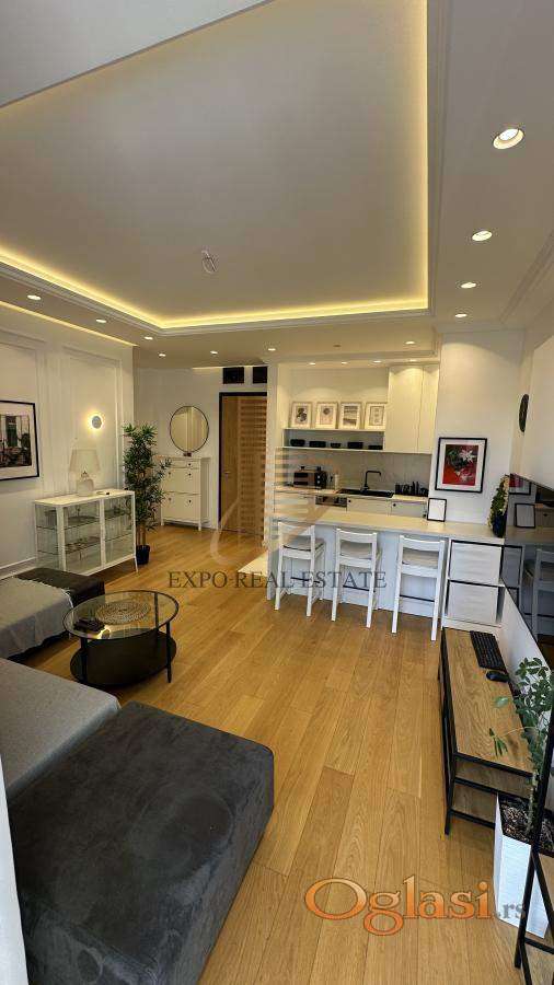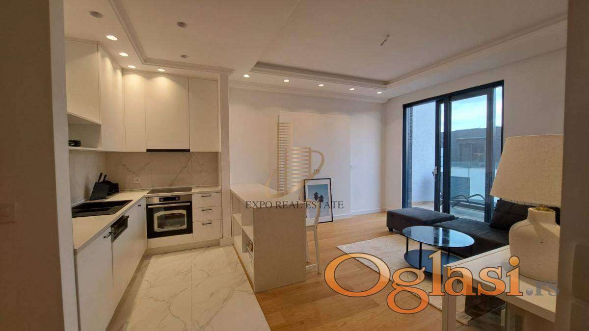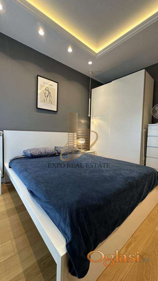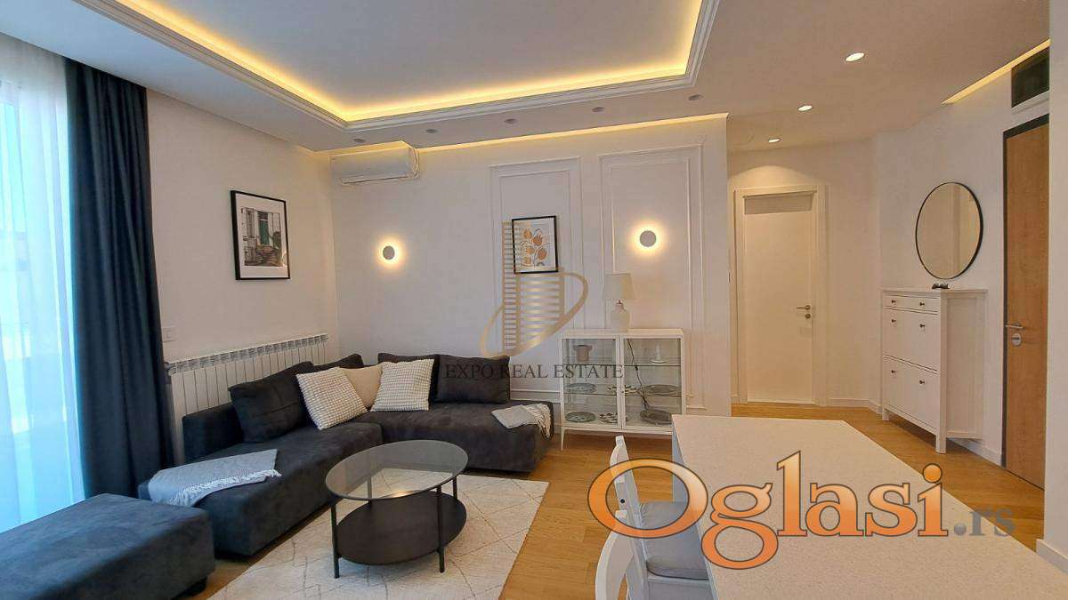 Stan je kompletno i moderno namešten, sa pažljivo biranim detaljima i kvalitetnim uređajima. Terasa pruža fantastičan pogled na Novi Beograd.
