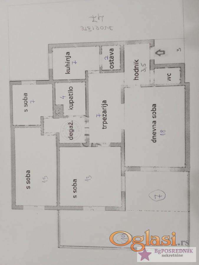 Prostorije: tri spavaće sobe, prostran dnevni boravak sa izlazom na terasu, odvojena kuhinja sa trpezarijom, kupatilo, toalet i ostava.