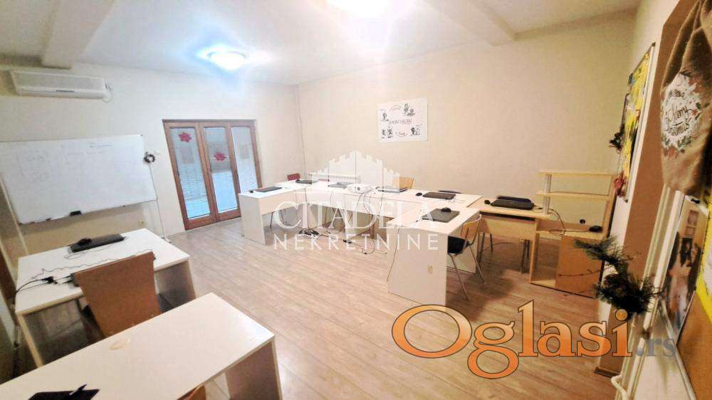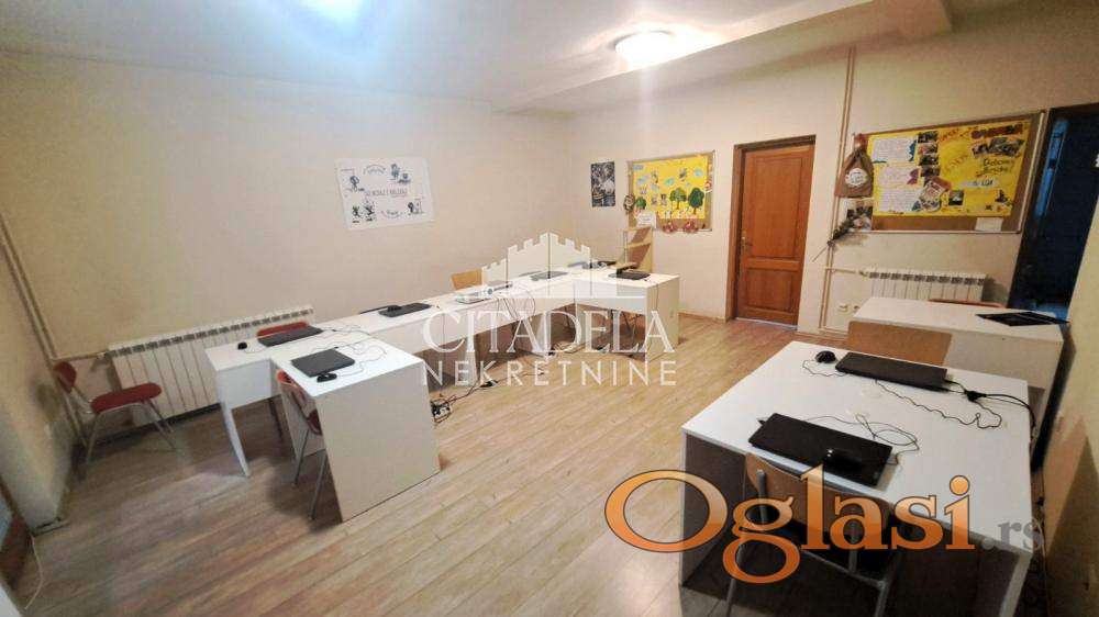 U prilici smo da vam ponudimo izuzetan prostor na lepoj lokaciji. Pogodan je za kancelarijski prostor raznih vrsta edukacija i slično. Trenutno je škola za programiranje. Stan se izdaje isključivo za mirnu delatnost i ne izdaje se za stanovanje. U CENU ZAKUPA SU URAČUNATI SVI TROŠKOVI (centralno grejanje, struja i sl.) Useljiv odmah.