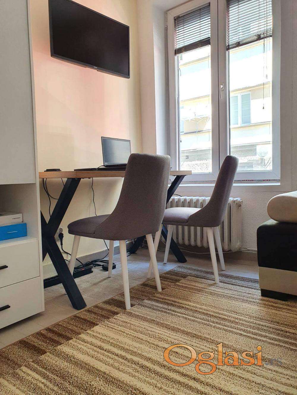 Izdaje se manji studio na odličnoj lokaciji,pogodan za studenta,ili zaposlenu osobu.Klima,cg,video nadzor,ktv,internet.Troškovi su oko 70e mesečno.Useljiv od 15.marta.Može da se pogleda.