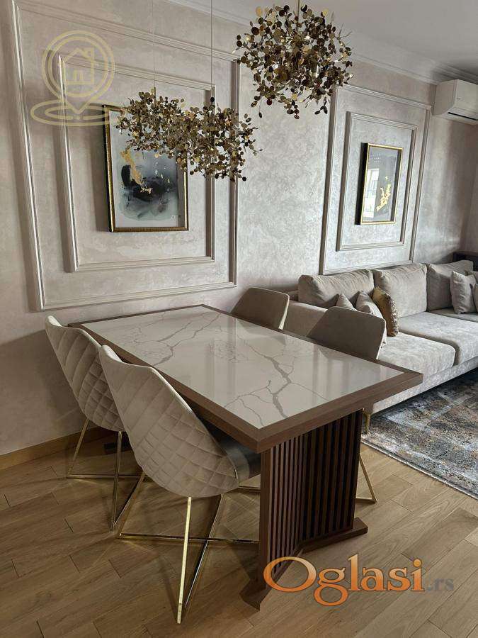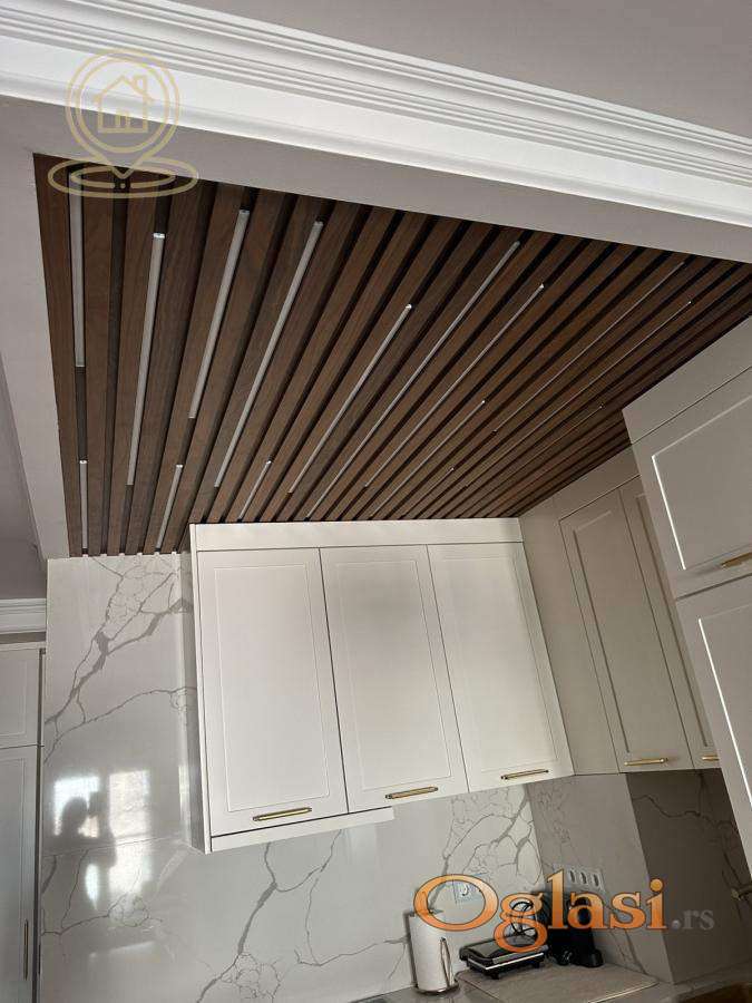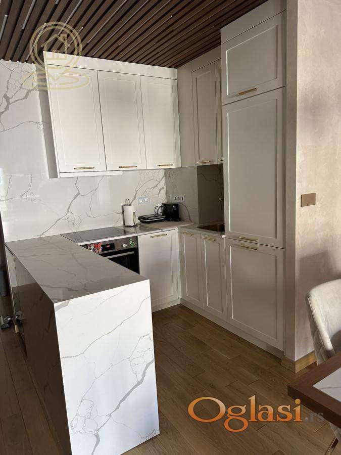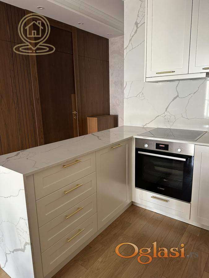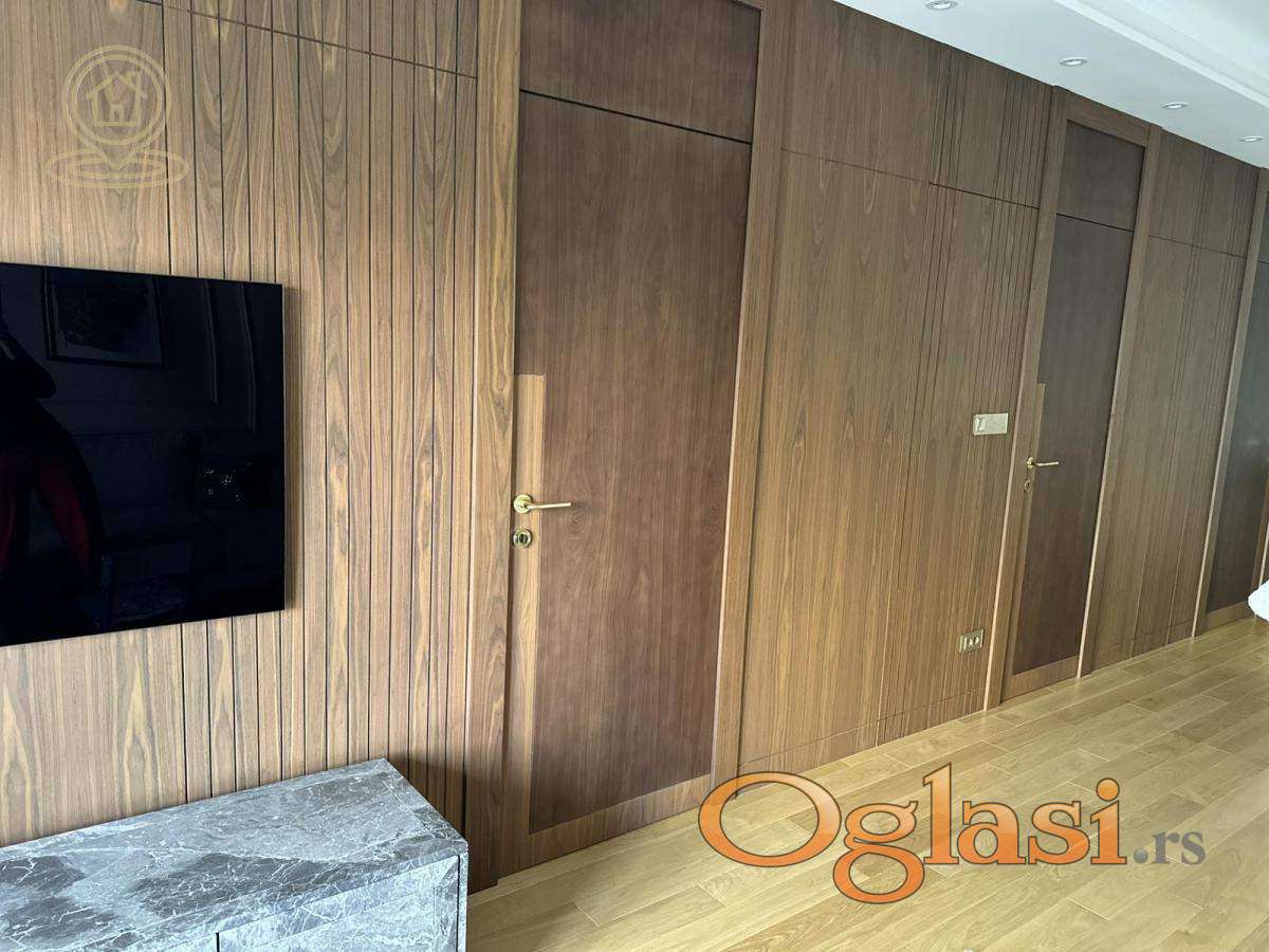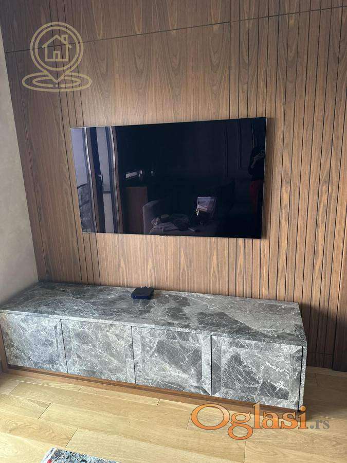 Stan je kompletno namešten ručno rađenim nameštajem po meri i vrhunskom Bosh tehnikom: klima uređaj, TV, mašina za pranje i sušenje veša, sudomašina, frižider, šporet, rerna, ugradni plakari.