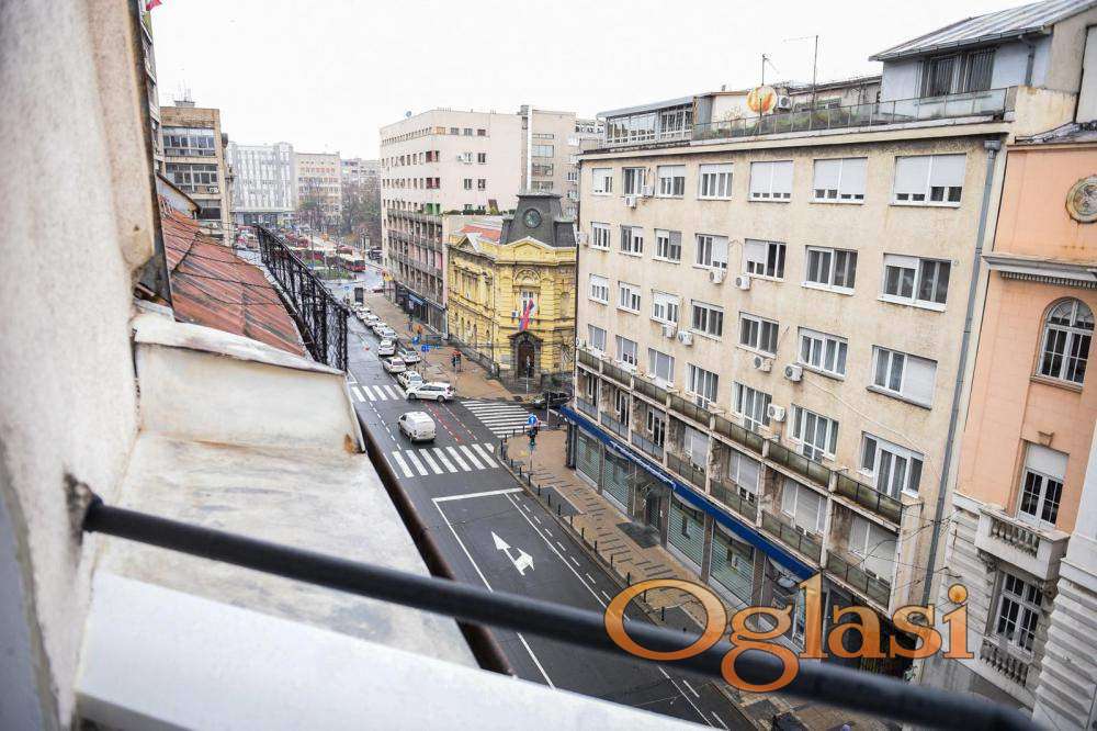 Raspored prostorija -prostran dnevni boravak sa trpezarijom,dve komforne spavace sobe,potpuno opremljena kuhinja ,moderno kupatilo i terasa sa pogledom prema Trgu Republike i Studentskom trgu.