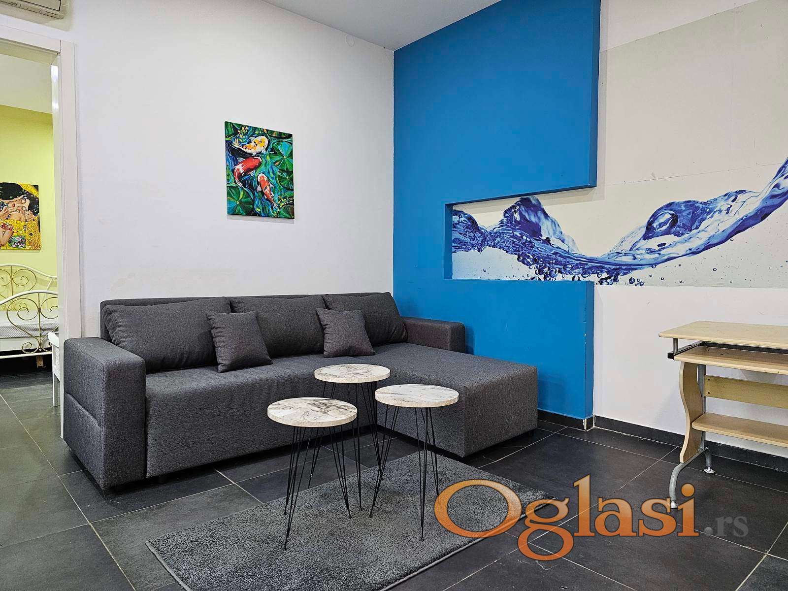 Izdaje se moderno i prijatno opremljen dvosoban stan površine 57m², smešten u prizemlju zgrade, u samom centru Novog Sada – Šafarikova ulica.