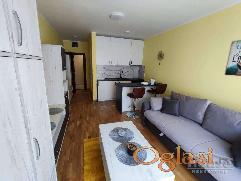 Stan ima 24m2, sastoji se iz predsoblja, kupatila, sobe sa šank kuhinjom i francuskog balkona.