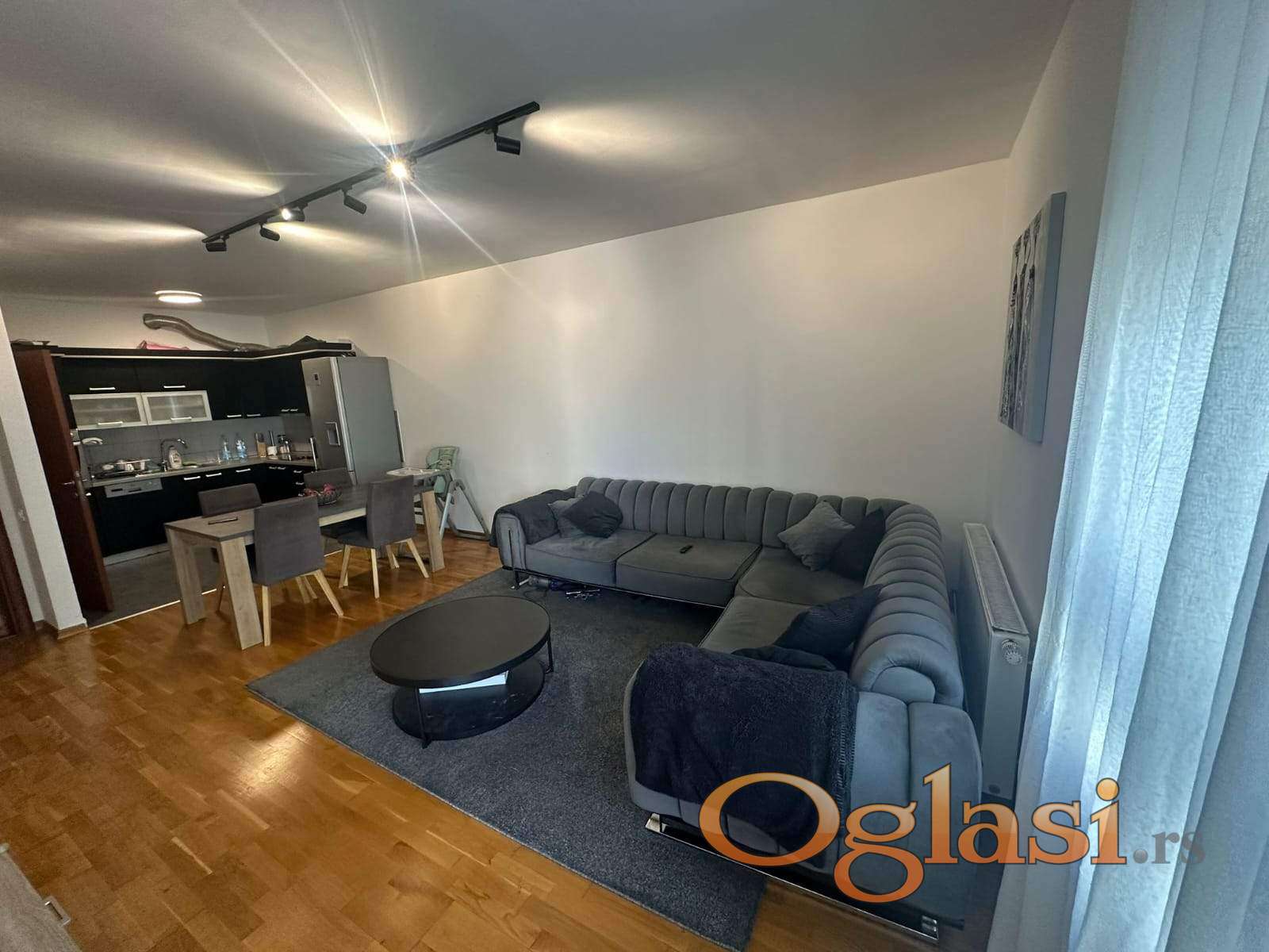 Stan je moderno opremljen i funkcionalno organizovan – sastoji se od prostrane dnevne sobe sa trpezarijom i kuhinjom, spavaće sobe, kupatila i terase. U cenu zakupa je uključeno i garažno mesto.