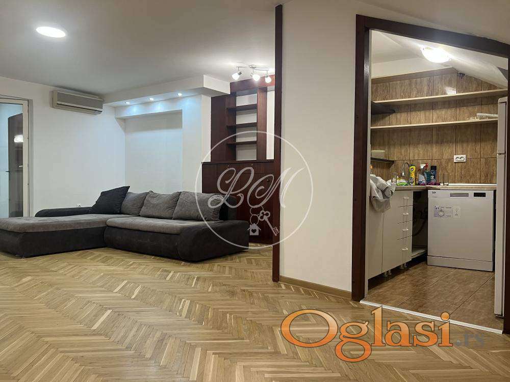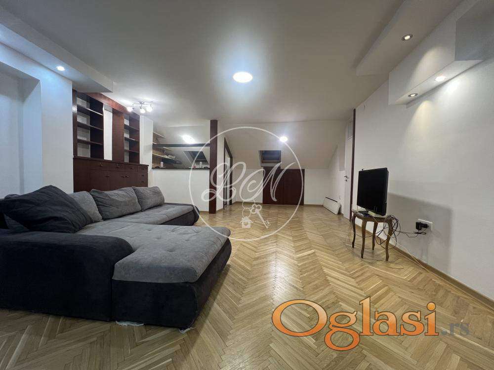 U samom centru Zemuna, na petom spratu potkrovlja zgrade bez lifta, nalazi se ovaj šarmantni, renoviran, trosoban stan od 72m2 ukupne površine, uknjižen na 51m2 redukovane površine.