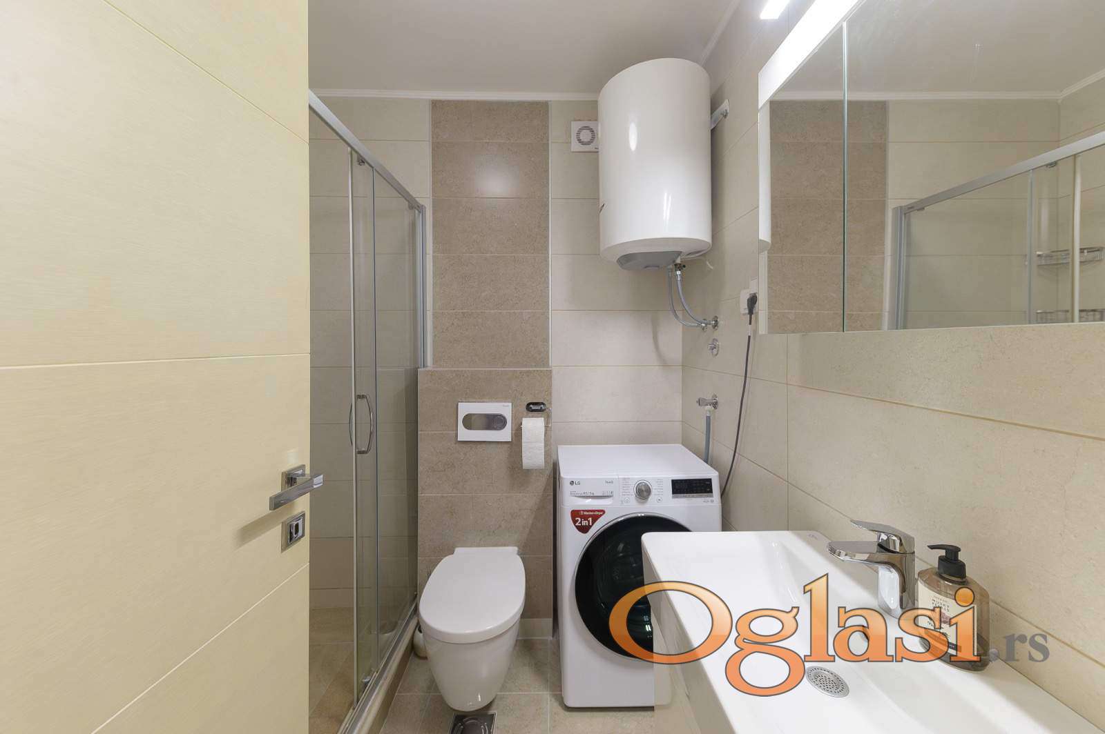Kupatilo je opremljeno tuš-kabinom, mašinom za pranje i sušenje veša.