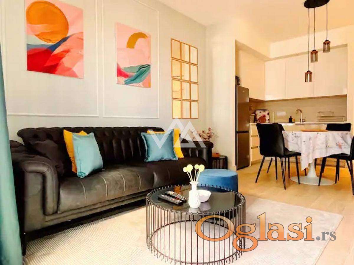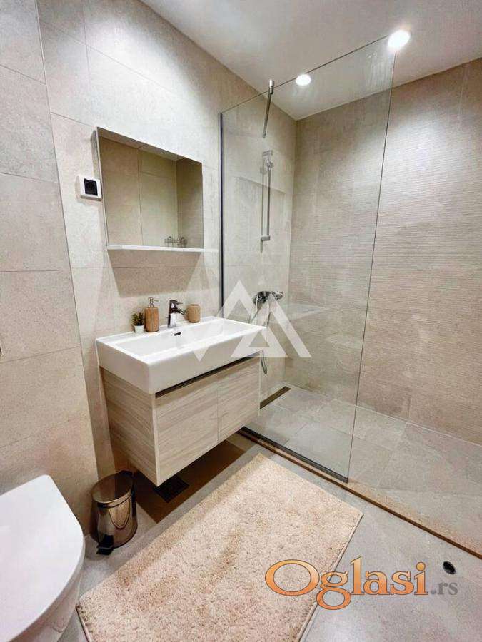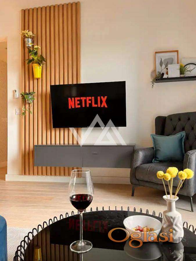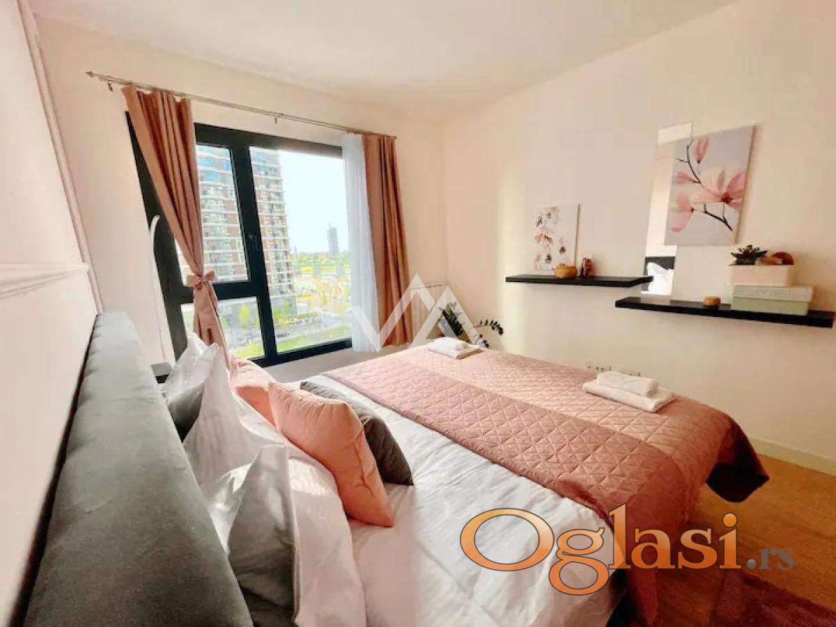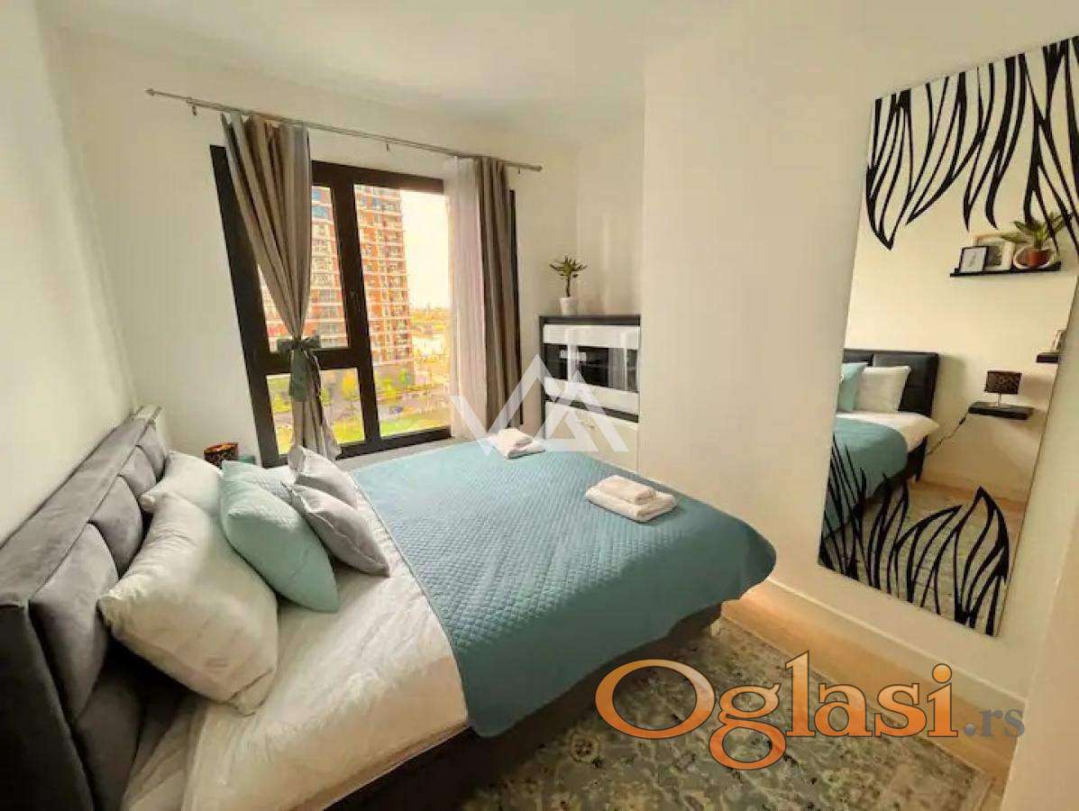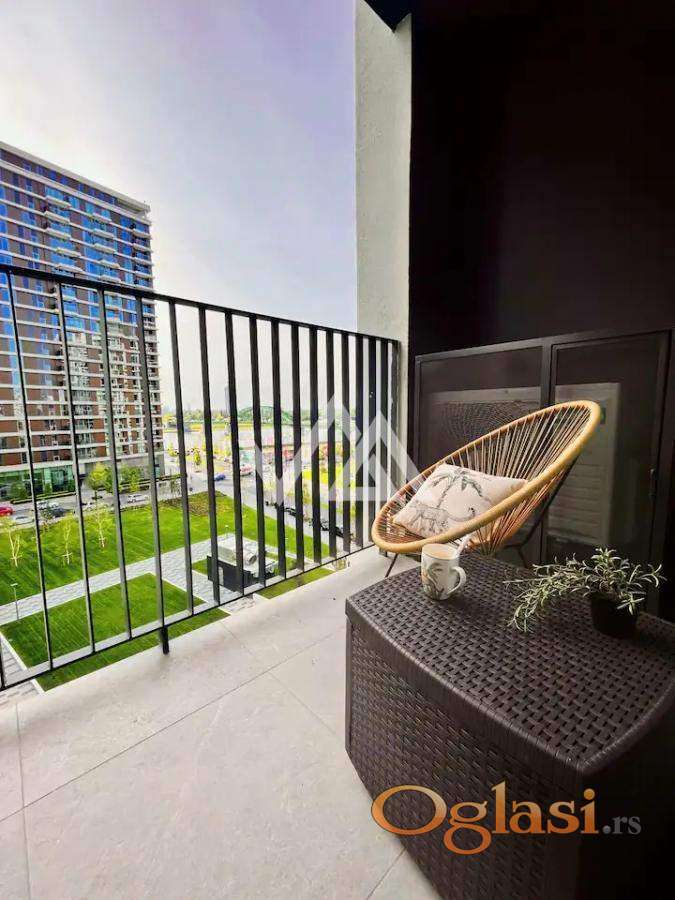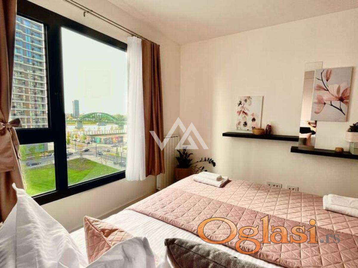 Stan je na petom spratu i ima pogled na reku i park. Stan se sastoji od dve spavaće sobe od kojih je jedna master room, dva kupatila, vešernica, dnevna soba sa izlazom na terasu, kuhinjom i hodnikom. Stan je koloritno sređen i ima svoj lični pečat.