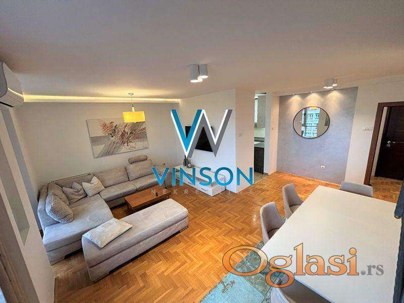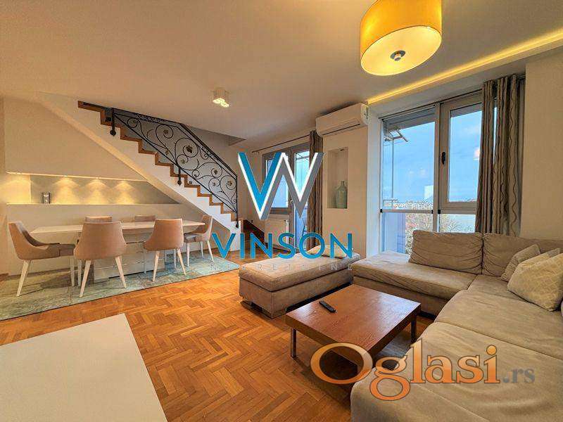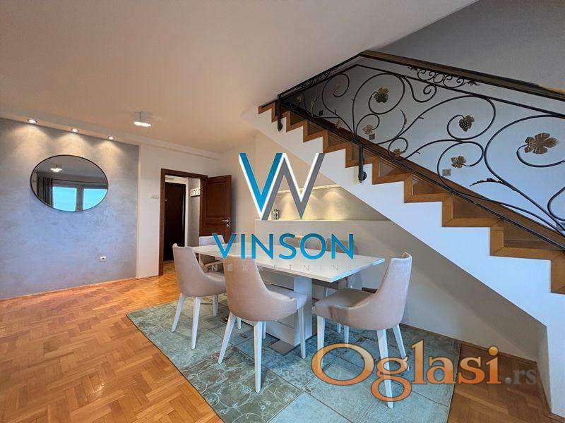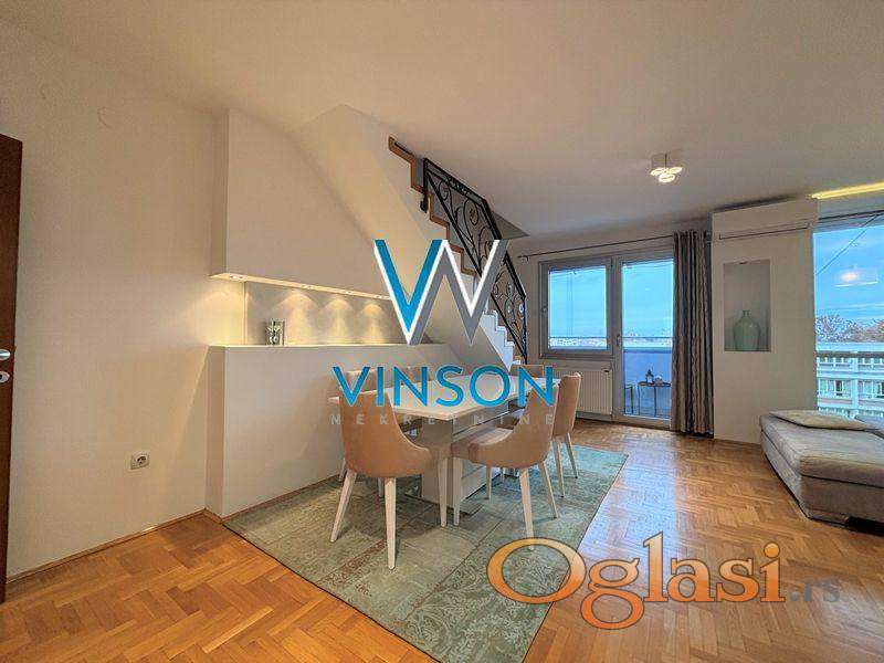 Novi Sad, Sajam, Bulevar kralja Petra I. Izdvajamo iz ponude kompletno namešten trosoban dupleks stan kod Mašinske škole i Novosadskog sajma. Ovaj lep stambeni prostor čine dve etaže. Donju etaži čini komforan dnevni boravak sa trpezarijom, odvojena kuhinja, ostava, toalet i velika terasa. Gornju etažu čine dve spavaće sobe i kupatilo sa tuš kabinom. Ulično orijentisan. Izdavanje na duži vremenski period zakupcima bez kućnih ljubimaca. Pozicioniran na V spratu stambene zgrade sa liftom. Useljiv odmah. (Vinson nekretnine, Novi Sad, Reg. br. posrednika: 1085)