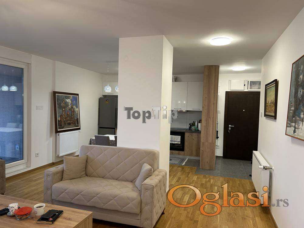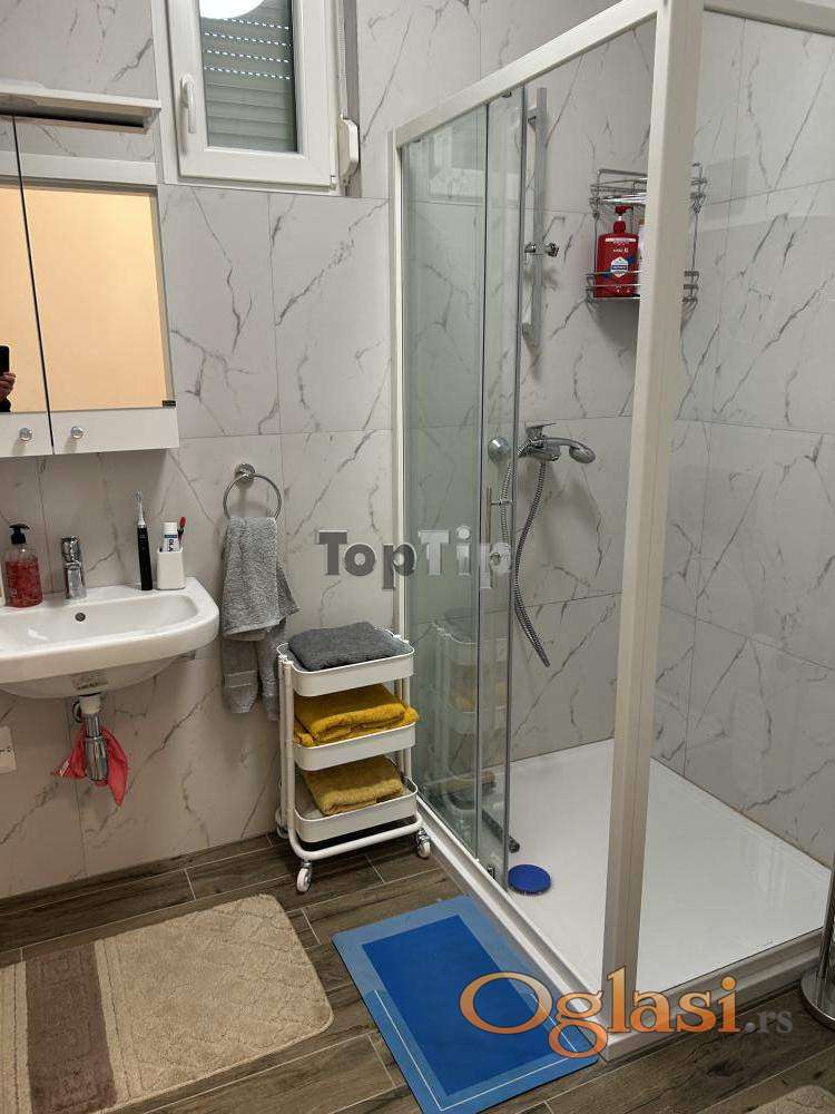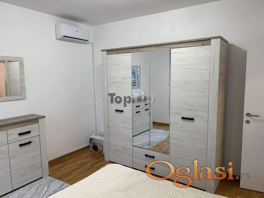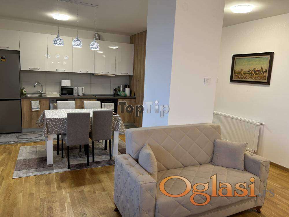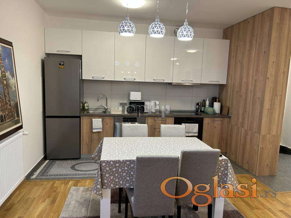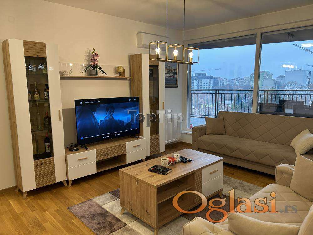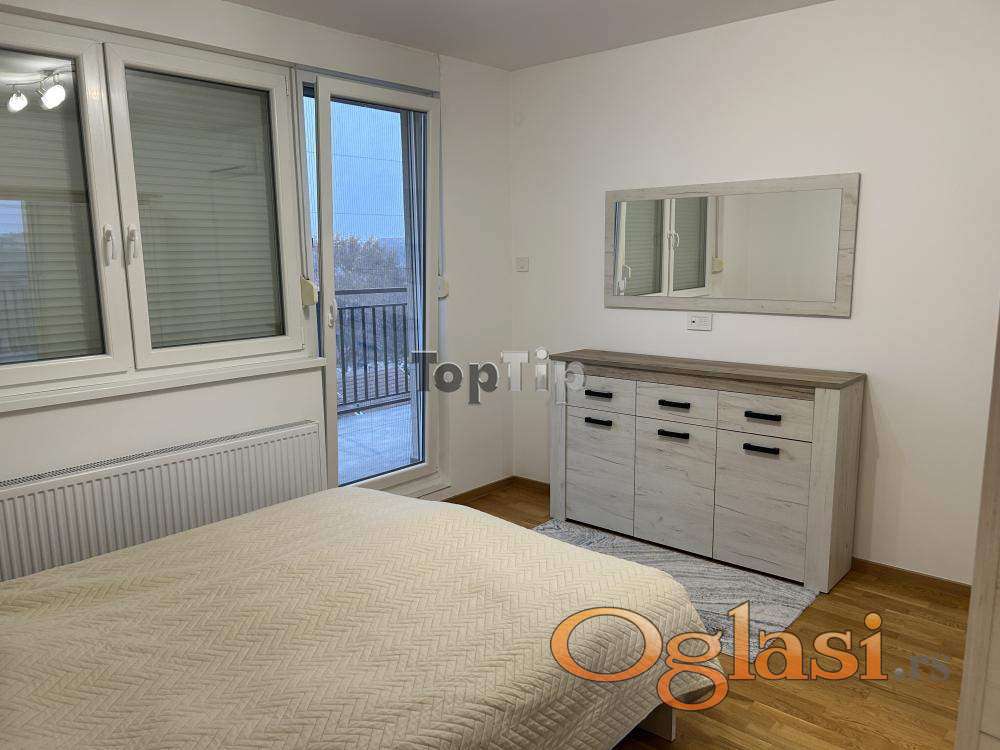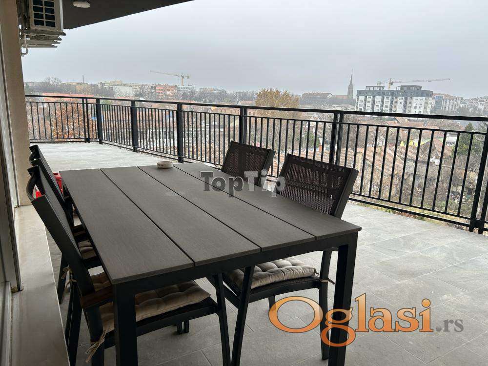 Luksuzno opremljen stan 130m2, dnevni boravak, kuhinja i trpezarija zajedno, dve spavaće sobe, dva kupatila, velika terasa, gasno grejanje, garaža u suterenu zgrade. Zgrada poseduje lift koji se spušta do suterena.