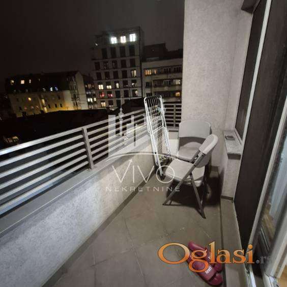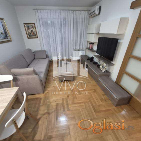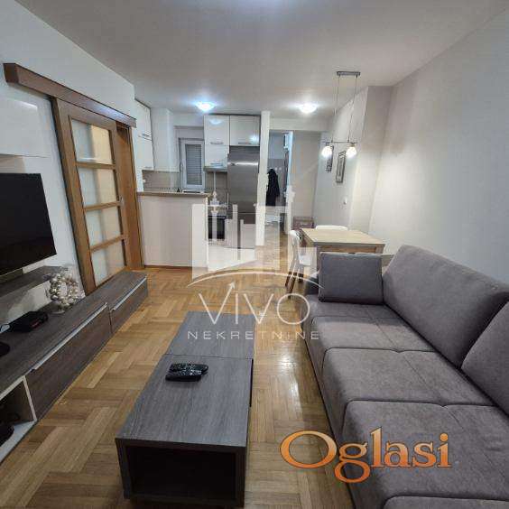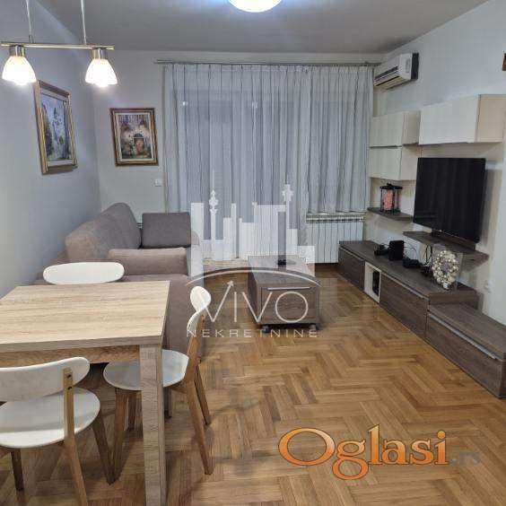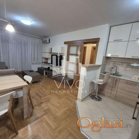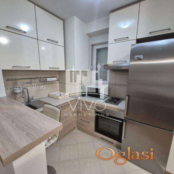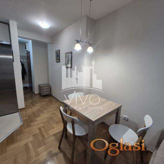 U zgradi novije gradnje, dugoročno se izdaje kompletno opremljen jednoiposoban stan, svetao, dvorišno orjentisan (J-Z). Stan je funkcionalnog rasporeda. Ulazno predsoblje sa velikim ugradnim plakarom, dnevna soba sa trpezarijskim delom i kuhinjom sa šankom. Iz dnevne sobe se izlazi na terasu. Kliznim vratima je odvojena spavaća soba i kupatilo.