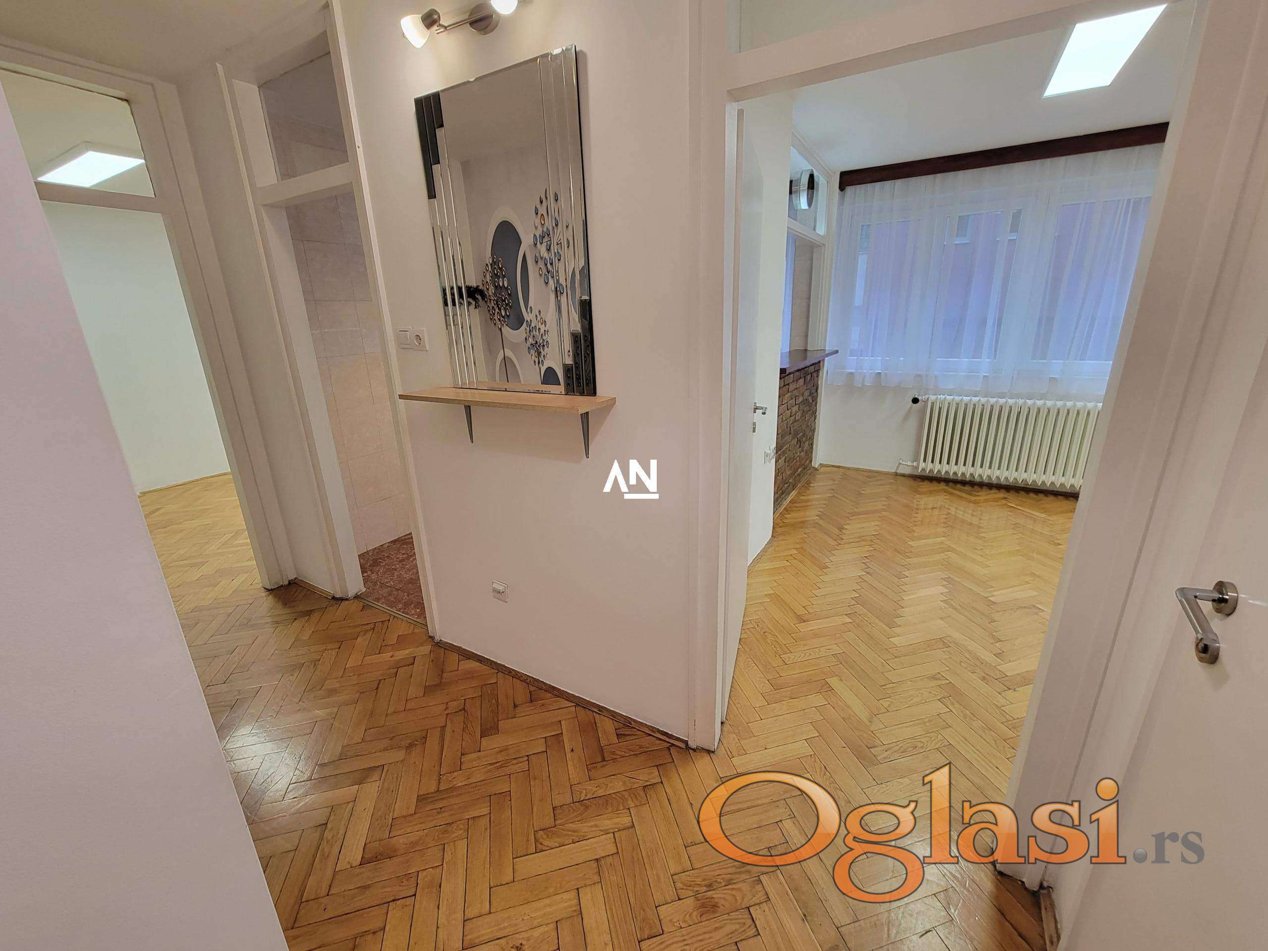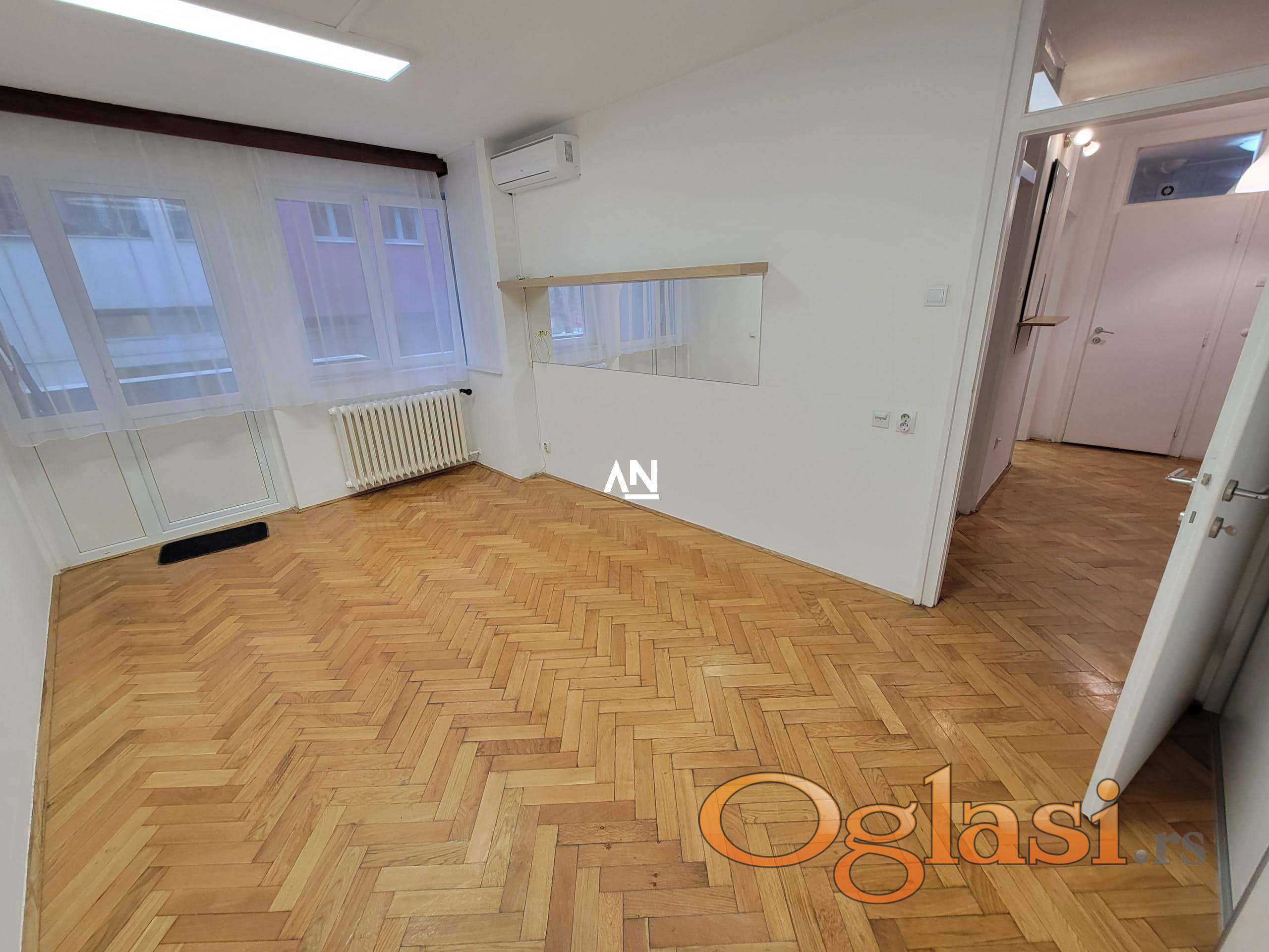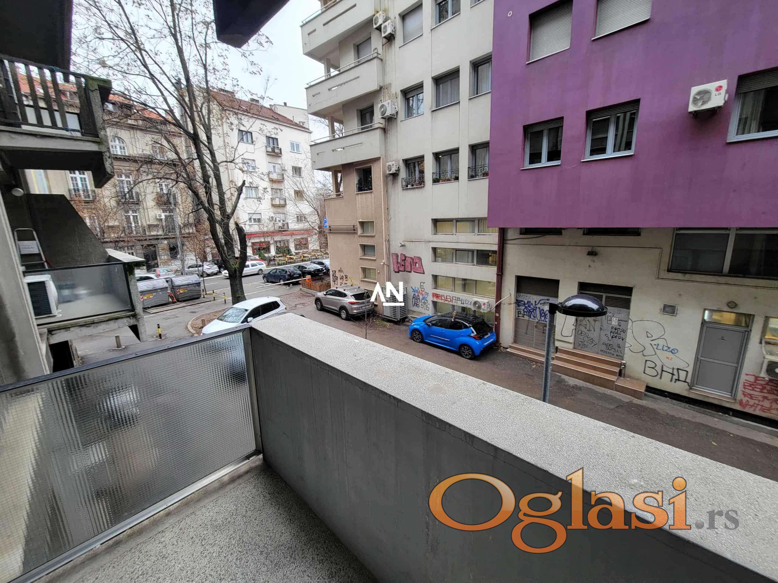 We are renting out an apartment in a fantastic location, right on the roundabout near the Kalenić market. It is suitable for living, but also for surgery, office, salon, driving school, etc. The apartment is located on the first floor of a building with an elevator, has 2 terraces and is rented out empty. It has a kitchen and a large built-in closet. The apartment is very bright, consists of an entrance hall, a living room with access to the first terrace of 3m2, a kitchen and dining room combined, a living room with access to a second terrace of 3m2 and a bathroom. The parking lot around the building is zoned, and near the building there is everything you need for everyday life. Mandatory deposit in the amount of one rent.