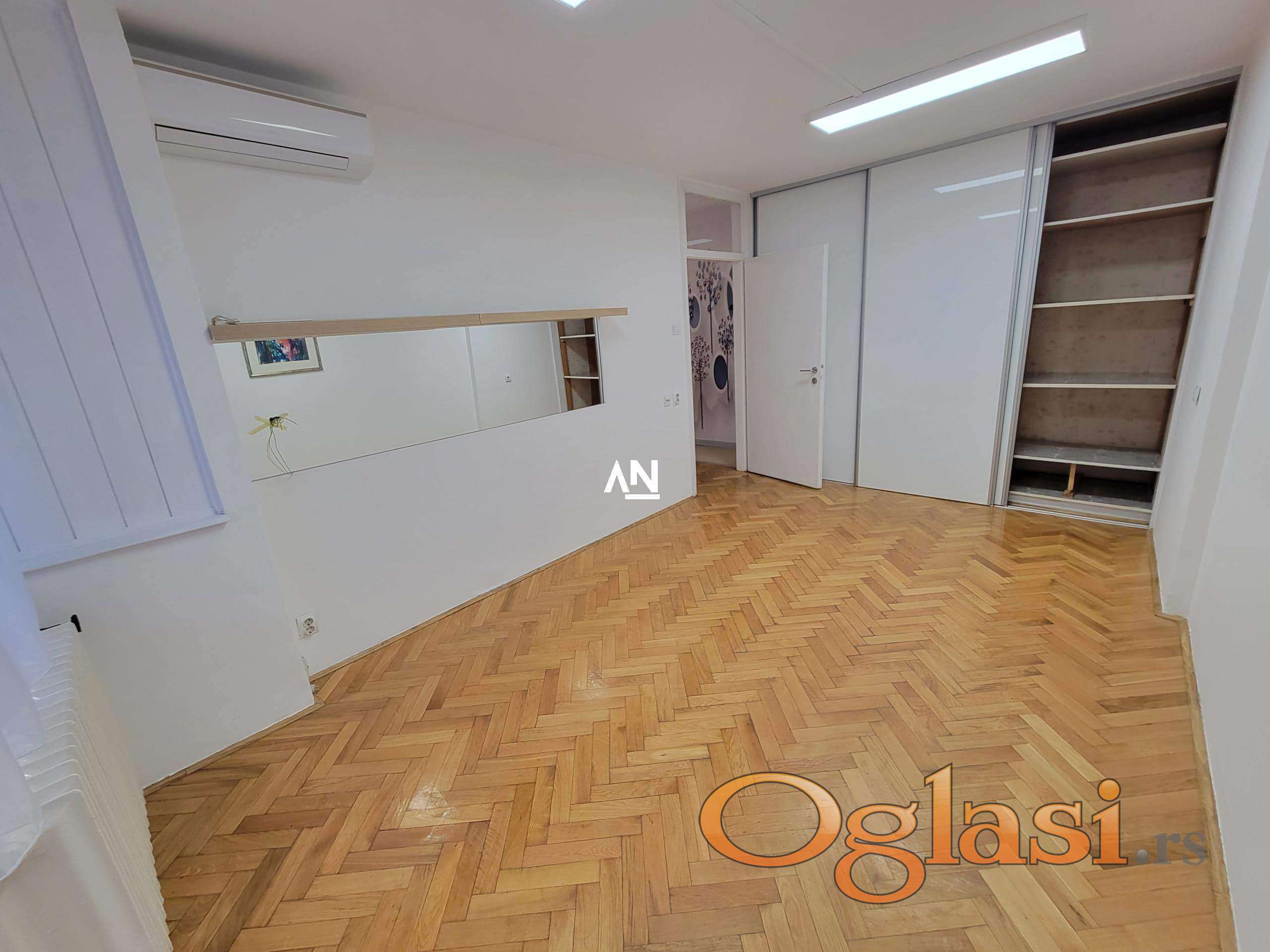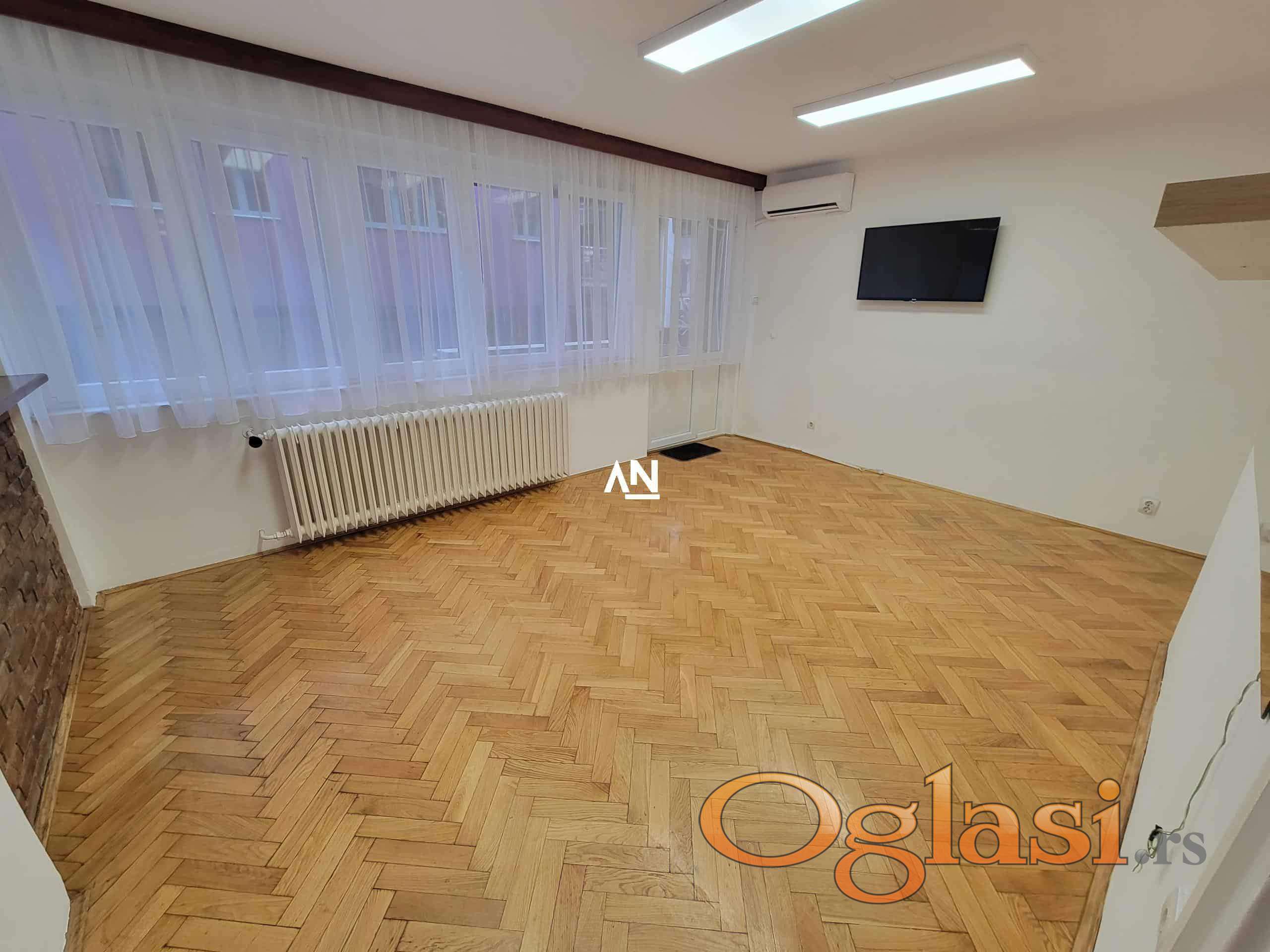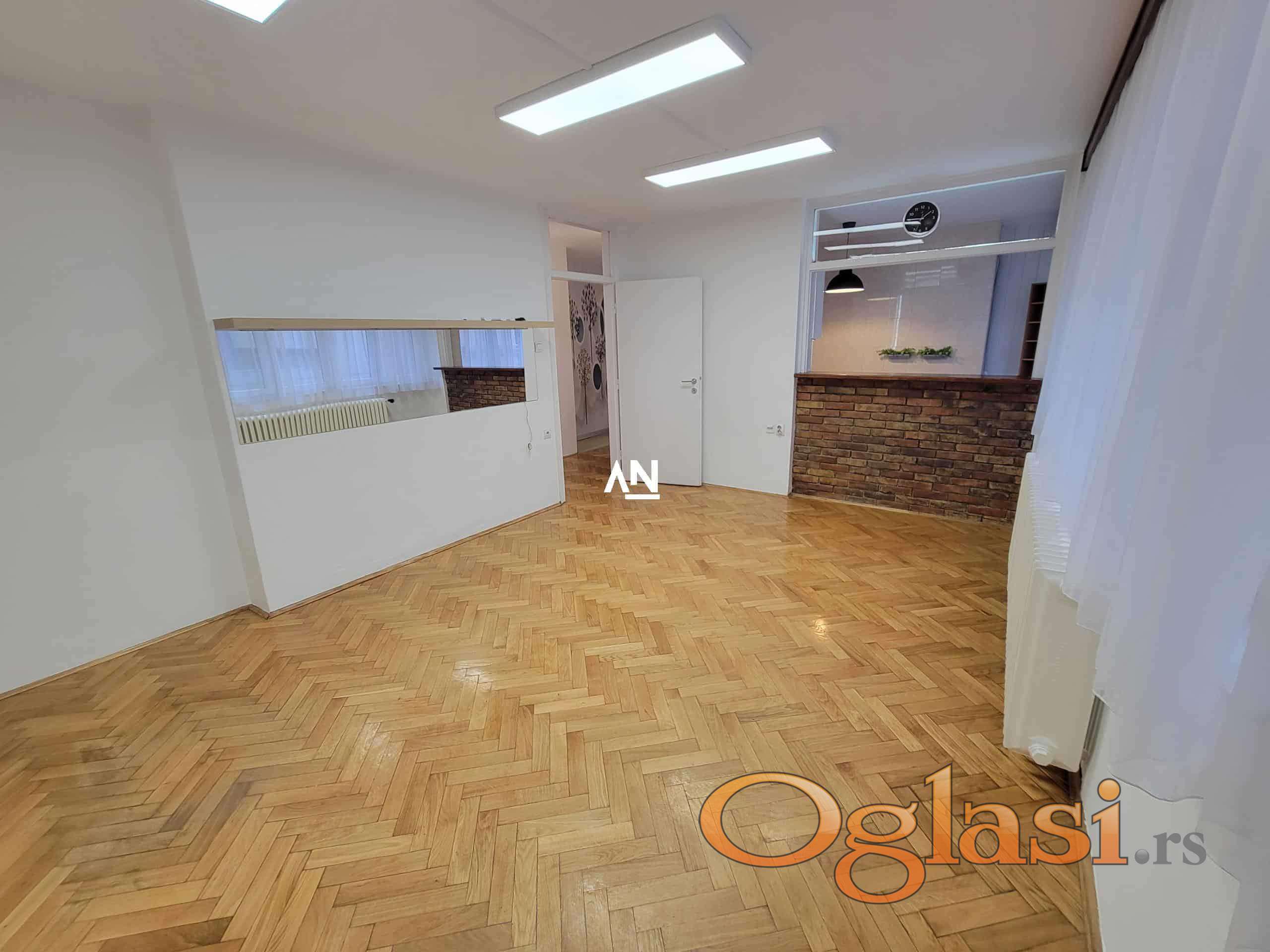 We are renting out an apartment in a fantastic location, right on the roundabout near the Kalenić market. It is suitable for living, but also for surgery, office, salon, driving school, etc. The apartment is located on the first floor of a building with an elevator, has 2 terraces and is rented out empty. It has a kitchen and a large built-in closet. The apartment is very bright, consists of an entrance hall, a living room with access to the first terrace of 3m2, a kitchen and dining room combined, a living room with access to a second terrace of 3m2 and a bathroom. The parking lot around the building is zoned, and near the building there is everything you need for everyday life. Mandatory deposit in the amount of one rent.