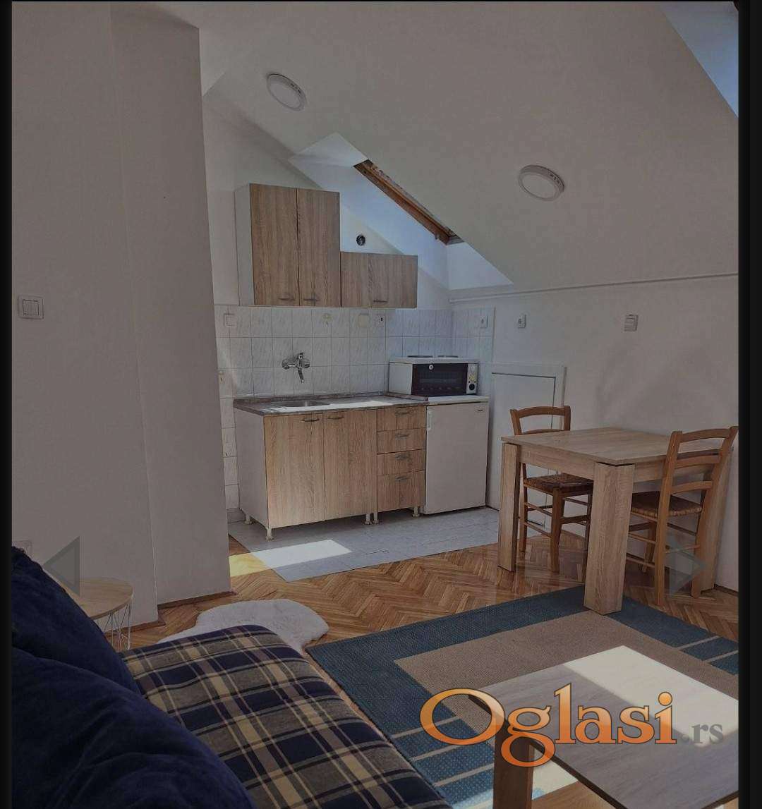 Izdajem nameštenu garsonjeru u potkrovlju na Bulevaru oslobodjenja. Nalazi se u blizini futoske pijace,ispred zgrade je autobuska stanica. Lift je do 6.sprata. Odmah je useljiva.