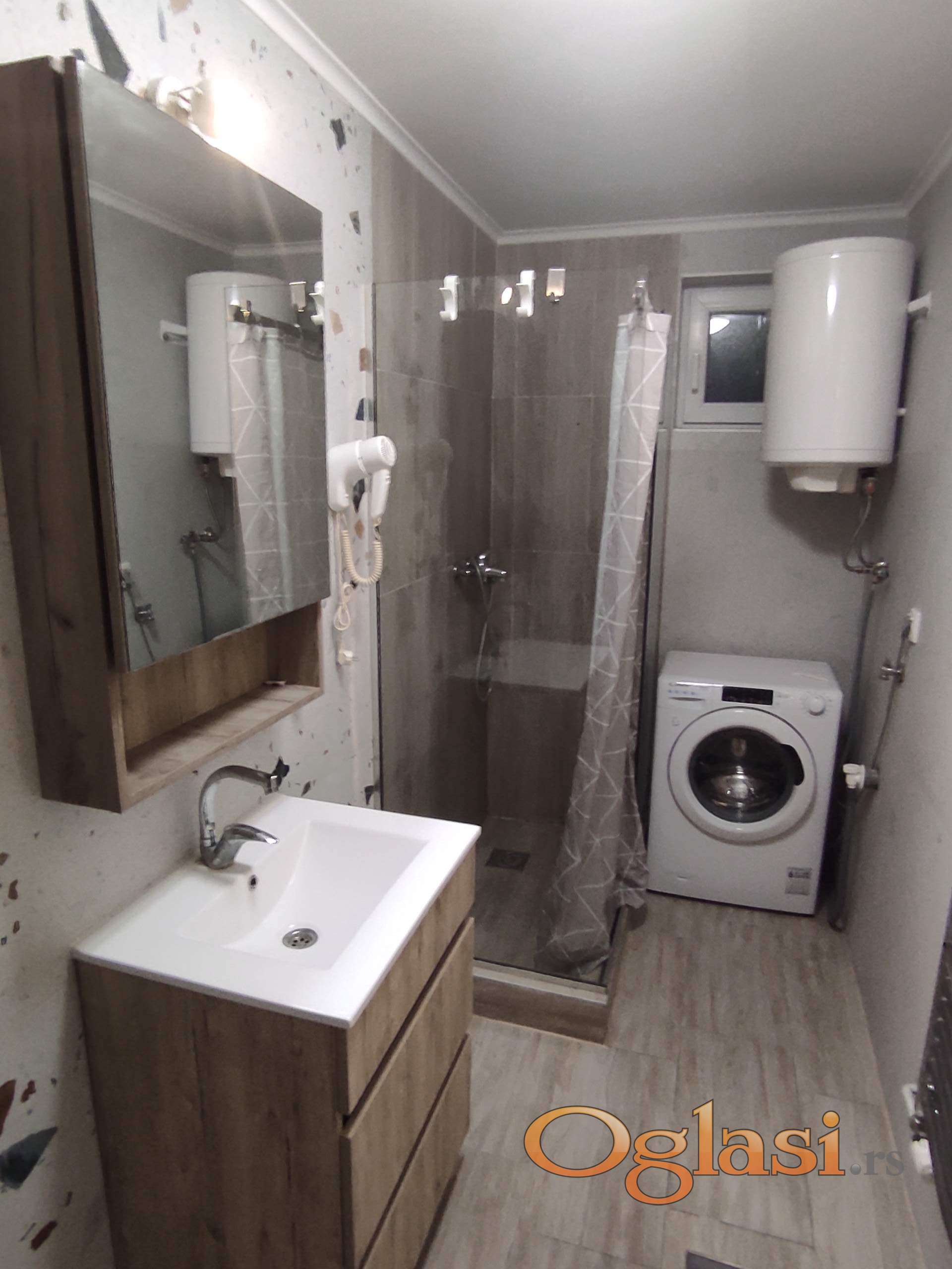 Stan je opremljen sa svime što je potrbno za život.Ploča za kuvanje,rerna,frižider,aspirator,veš mašina,cipelarnik,klima,TV...