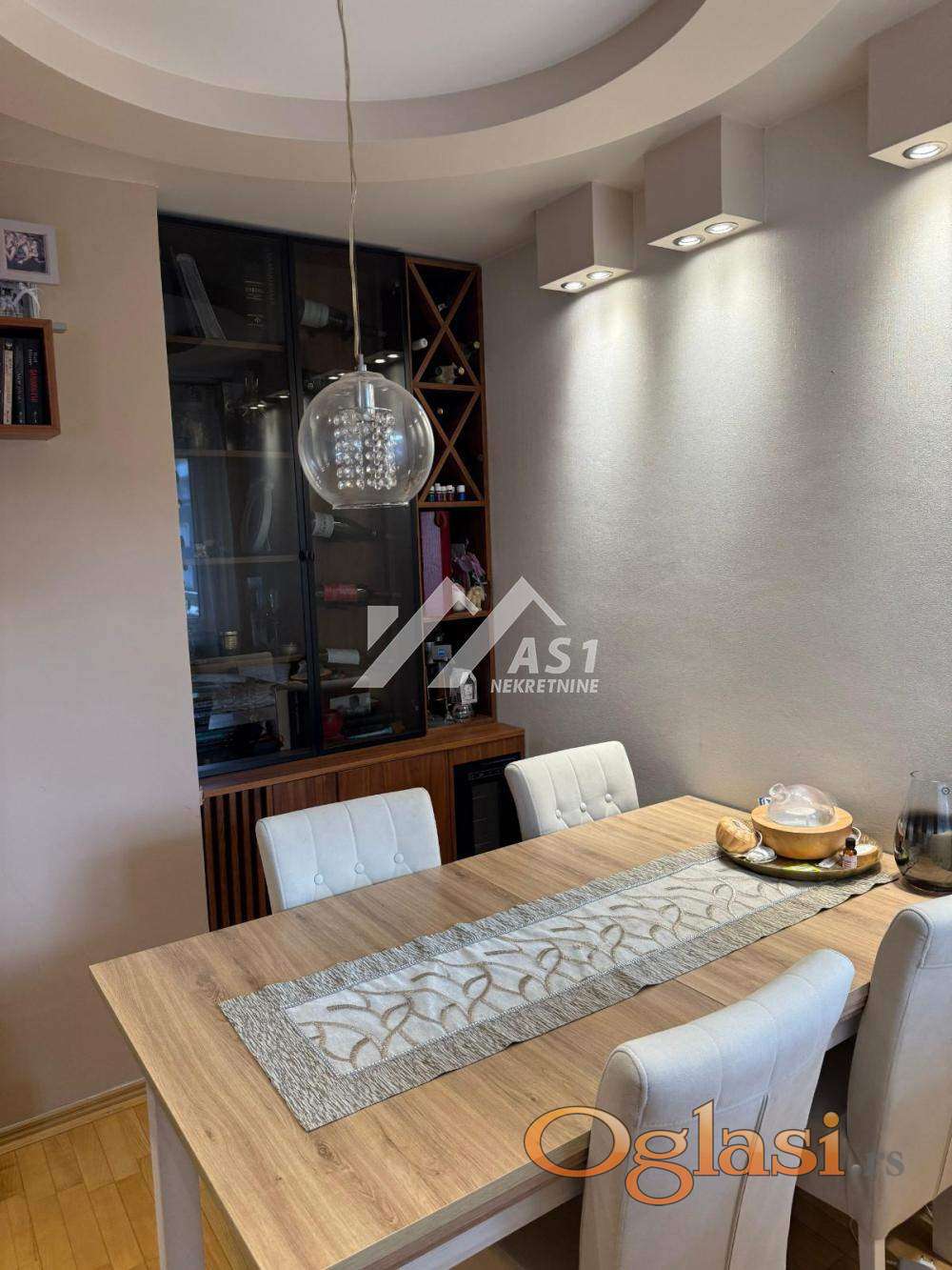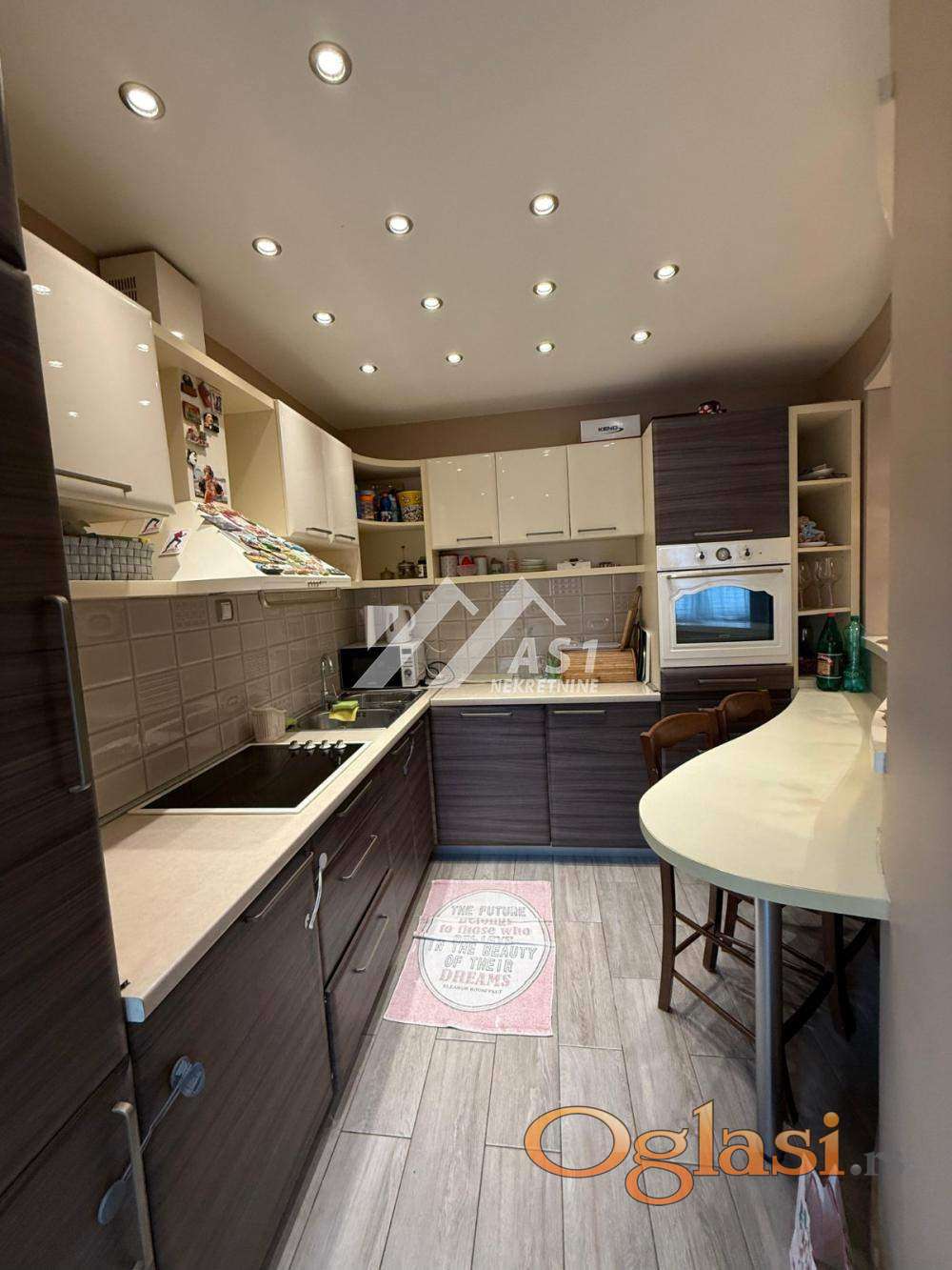 Kompletno je opremljen, poseduje: veš mašinu, mašinu za sudove, sušilicu za veš, dva televizora, mikrotalasnu, rernu...