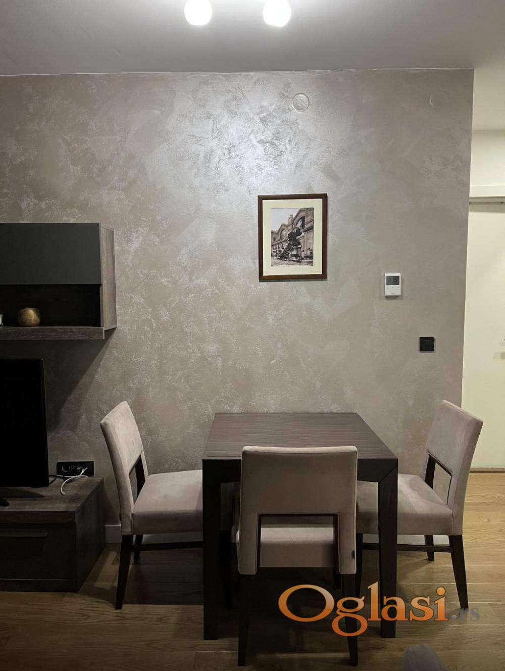 Kompletno namešten dvosoban stan u stambenom kompleksu Kapije Vračara. U cenu uračunato parking mesto u podzemnoj garaži na nivou -2.Ima optički internet.