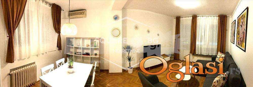 Stan preko puta Zire u Cvijićevoj ulici, 5 minuta od Vukovog spomenika, 47 m2, terasa dužinom celog stana, odličan raspored prostorija, izuzetno svetao i dvostrano orijentisan, kuhinja s prozorom na svetlarnik, dnevna soba s prozorom na Cvijićevu ulicu i svetlarnik, spavaća soba s pogledom na Cvijićevu ulicu, na pretposlednjem spratu šestospratne zgrade sa liftom, kompletno uređen i opremljen (dnevna soba, ugaona garnitura, stočići, natkasne, spavaća soba, krevet, ugradni ormar, noćni stočići i trpezarija) i svi uređaji (tv, mašina za veš, šporet, rerna, mikrotalasna, frižider). Zgrada ima samo za stanare parking u dvorištu (sa rampom i pod ključem). Posebno je interesantan zajednički prostor na krovu koji su stanari uredili i koristi se kao divna terasa o kojoj se brinu svi stanari, prava zelena oaza. Agencijska provizija 50%