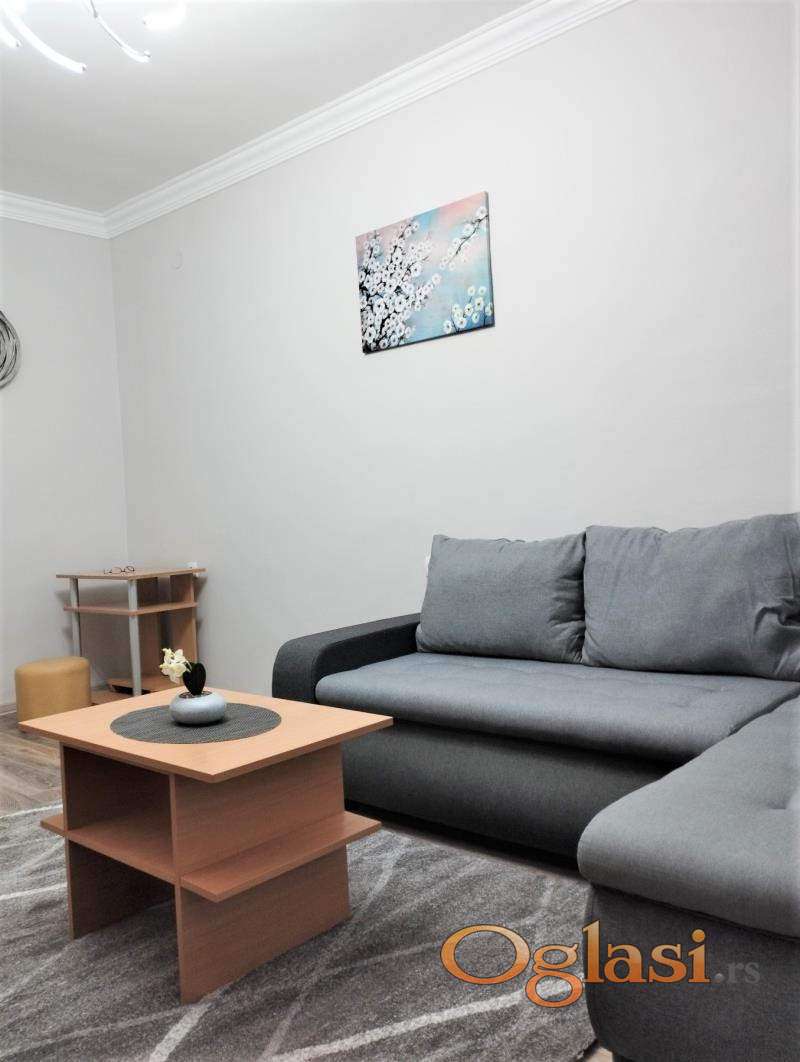 Stan se sastoji od ulaznog predsoblja, dnevnog boravka, kuhinje, spavaće sobe, kupatila i terase. U dnevnom boravku regal, ugaona garnitura, klub sto, radni sto.. U spavaćoj sobi dva kreveta sa novim dušecima, plakari i radni sto. U kuhinji nov kombinovani frižider , šporet sa ravnom pločom i nov aspirator.