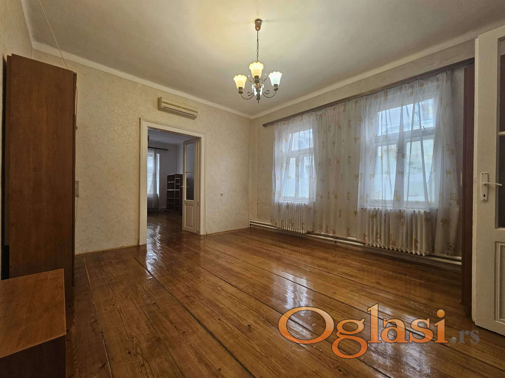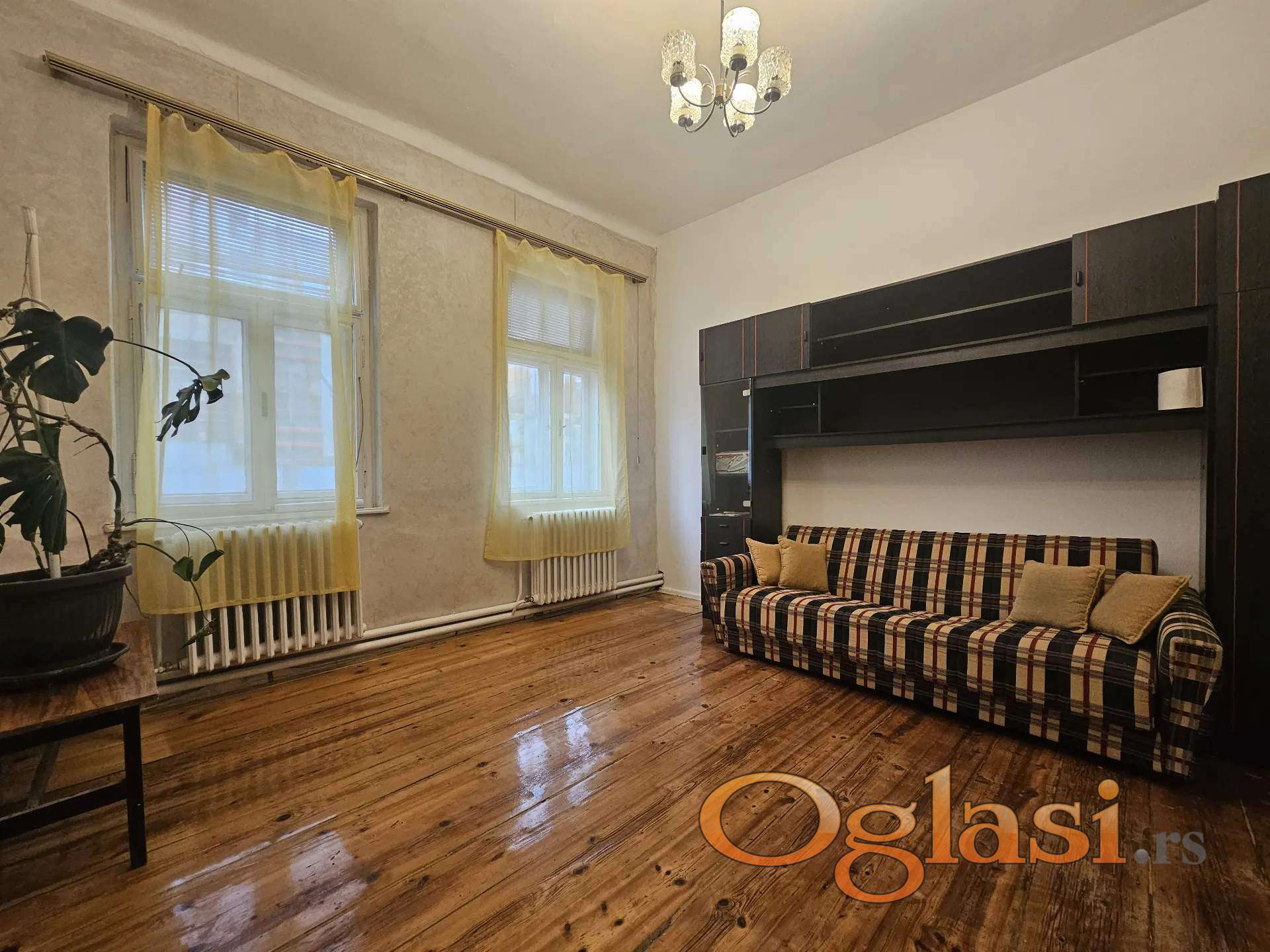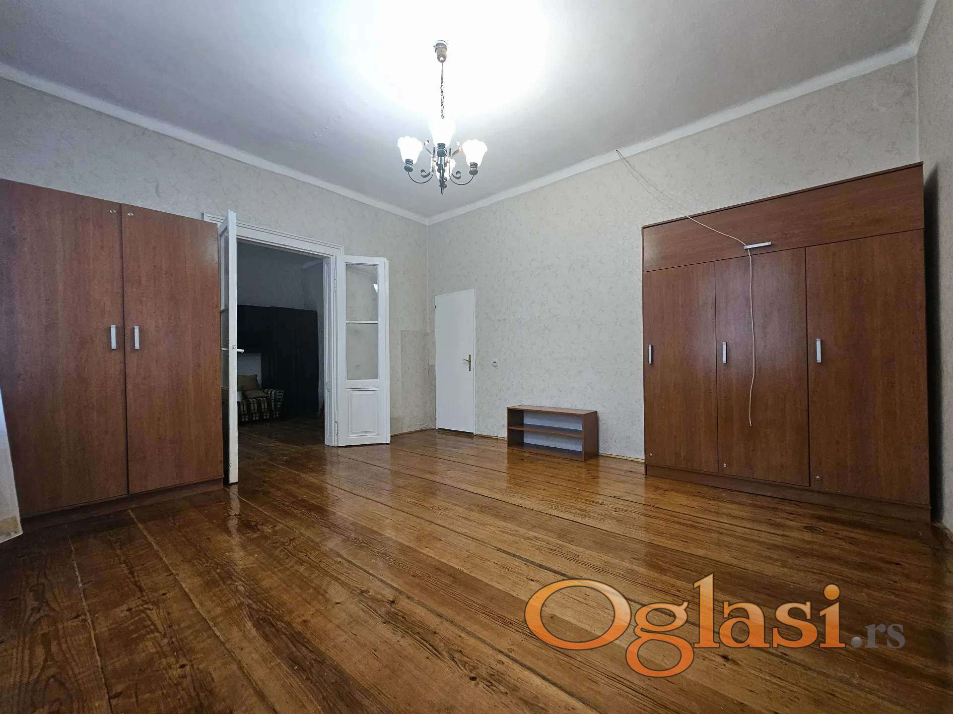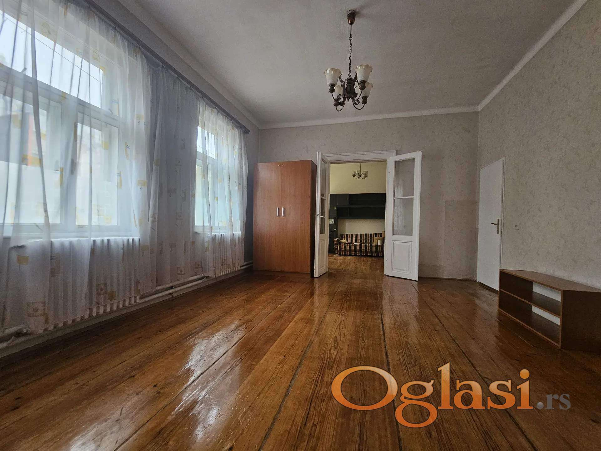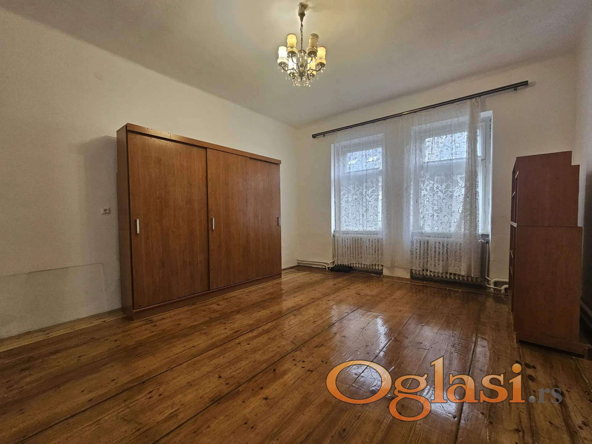 Ima 3 velike sobe, odvojenu kuhunju, predsoblje, kupatilo, spajz i podrum. Vrlo je svetao, salonski, sa visokim plafonima od 3,6m.
