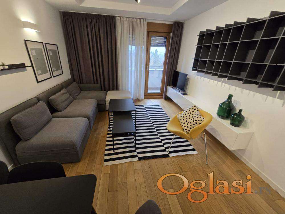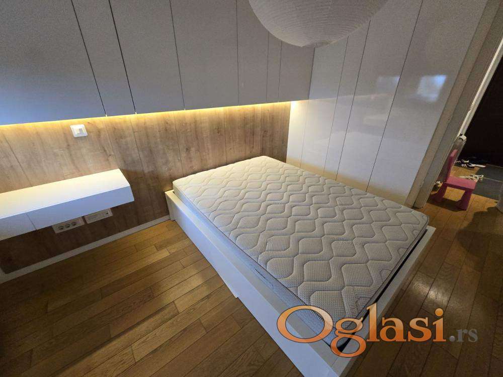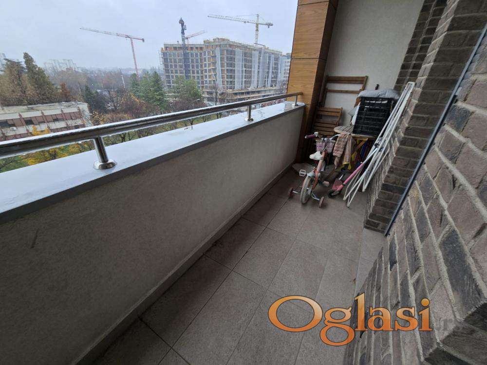 Ultra lux moderno opremljen stan, na odličnoj lokaciji- A Blok –pogled na ulicu Omladinskih brigada.Peti sprat, lamela A2.Opremljen sa posebno dizajniranim ugradnim namestajem i tehnikom, drvo aluminijum stolarijom,elektricnim roletnama, kliznim komarnicima, hrastovim parketom, Keramo Marazzi keramikom.Stan je sastavljen od kuhinje I trpezarije, dnevne I spavace sobe, kupatila I terase, povrsine 51 m2.