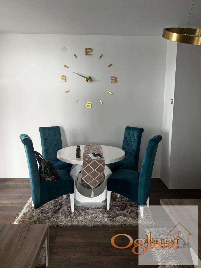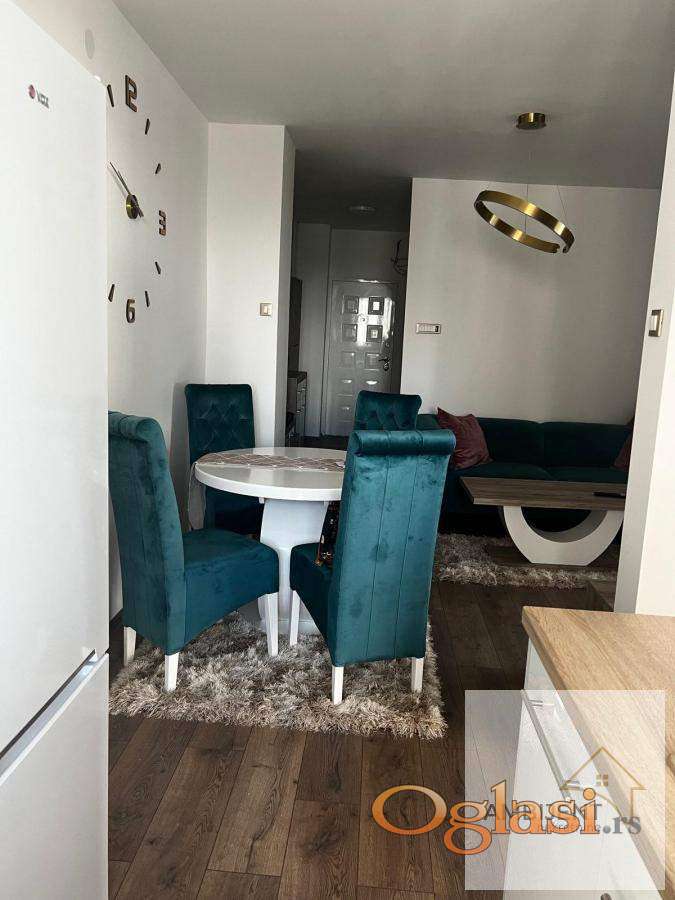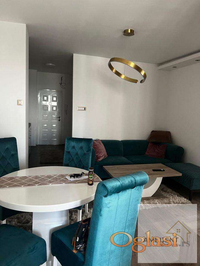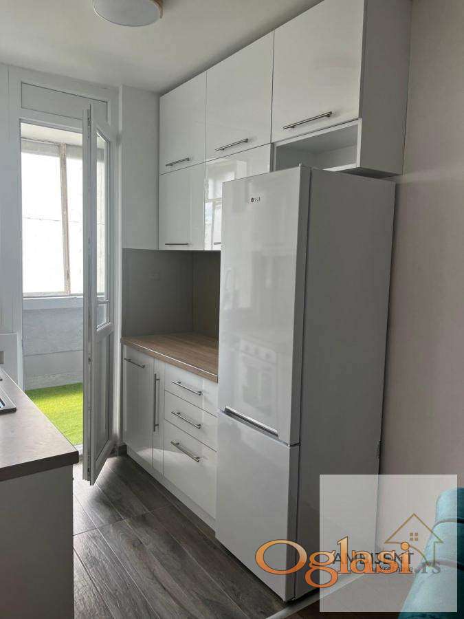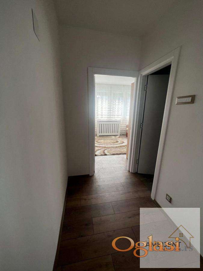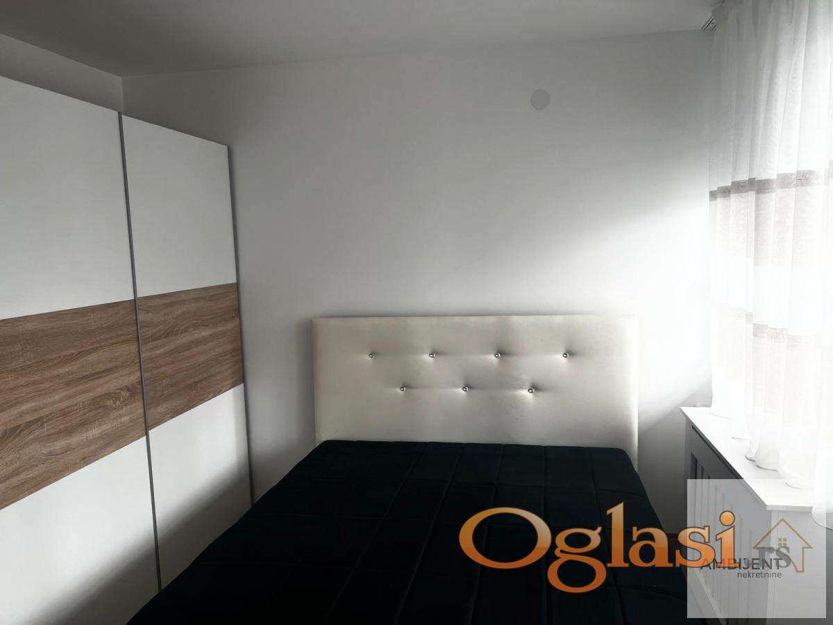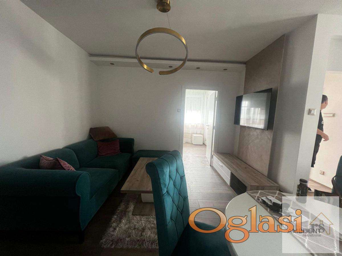Sastoji se od, prostrane dnevne sobe sa ugaonom garniturom, klub stolom i modernim rasvetnim telom, spavaće sobe sa velikim ormarom i udobnim ležajem, moderno opremljene kuhinje sa svim elementima i novim frižiderom, kupatila sa veš mašinom i ugradnim policama, hodnika koji obezbeđuje funkcionalan raspored prostorija.