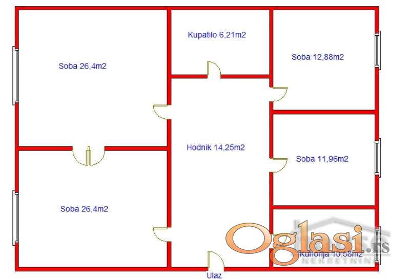 Stan ima 107m2, nalazi se na prvom spratu stambene zgrade, sastoji se iz predsoblja, dve sobe po 26m2, još dve sobe po 12m2, kuhinje sa trpezarijom i kupatila.