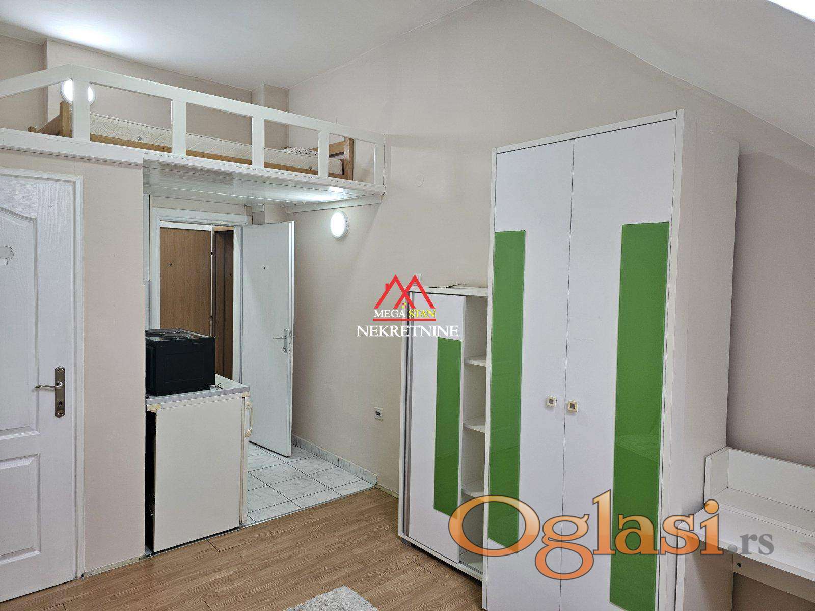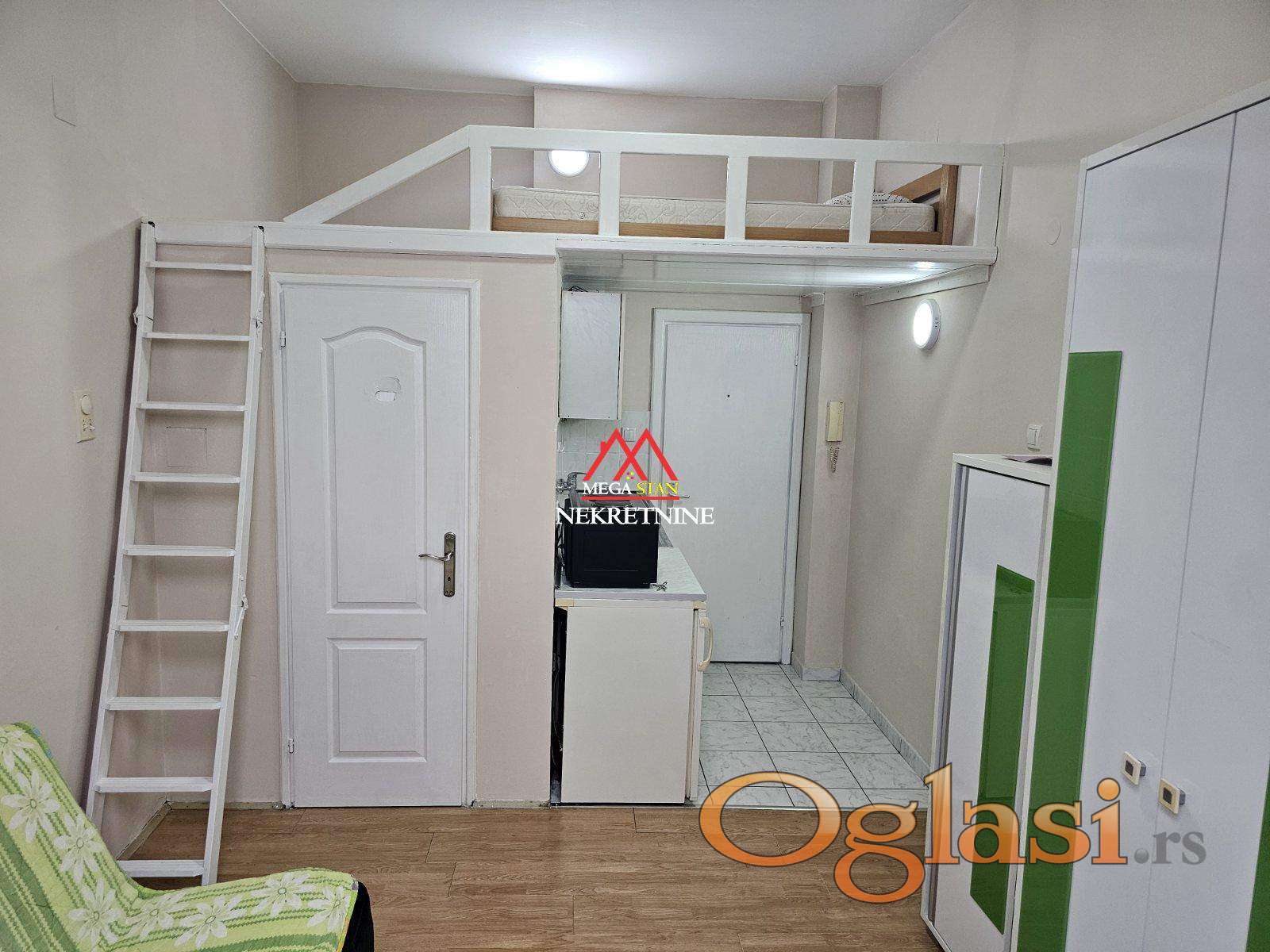 Garsonjera je maksimalno funkcionalna i odlično iskorišćenog prostora. Iznad kuhinje i kupatila nalazi se galerija sa krevetom, čime se oslobađa dodatni prostor u dnevnoj zoni. U ćošku ispod prozora smeštena je mala ostava, idealna za odlaganje stvari.