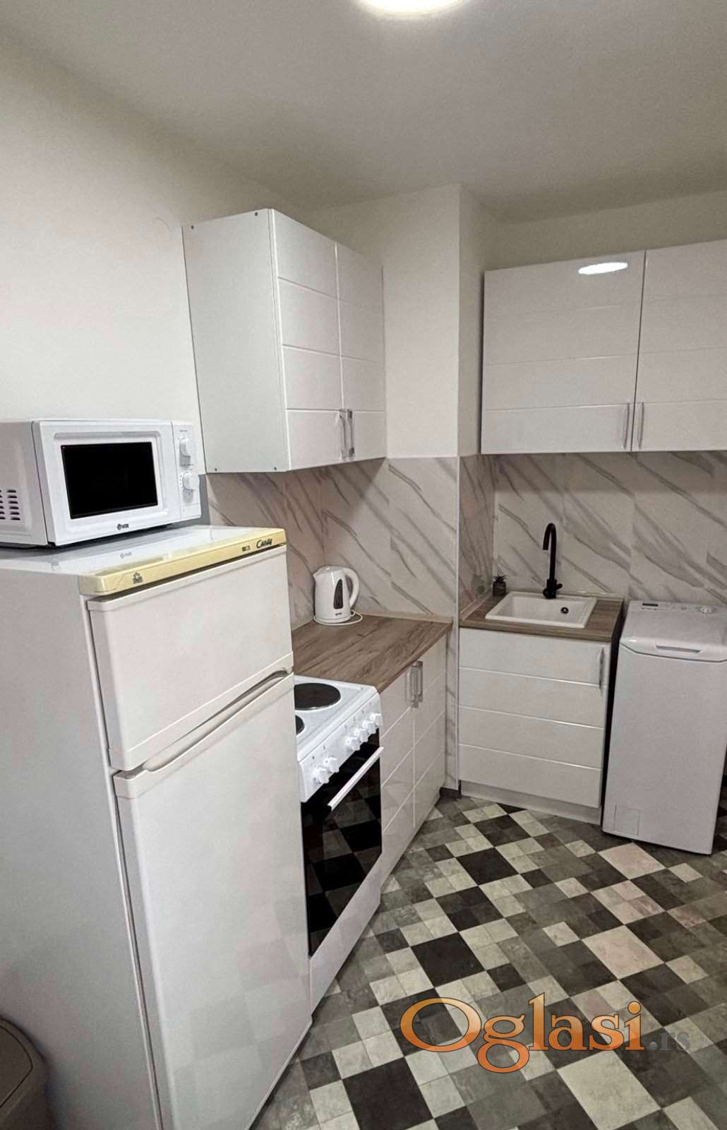 Opremljenost: Potpuno novi, nekorišćeni uređaji – šporet, veš mašina, frižider, klima, mikrotalasna, kuvalo za vodu. Skoro sav nameštaj sasvim nov, kao i zavese i tepisi.