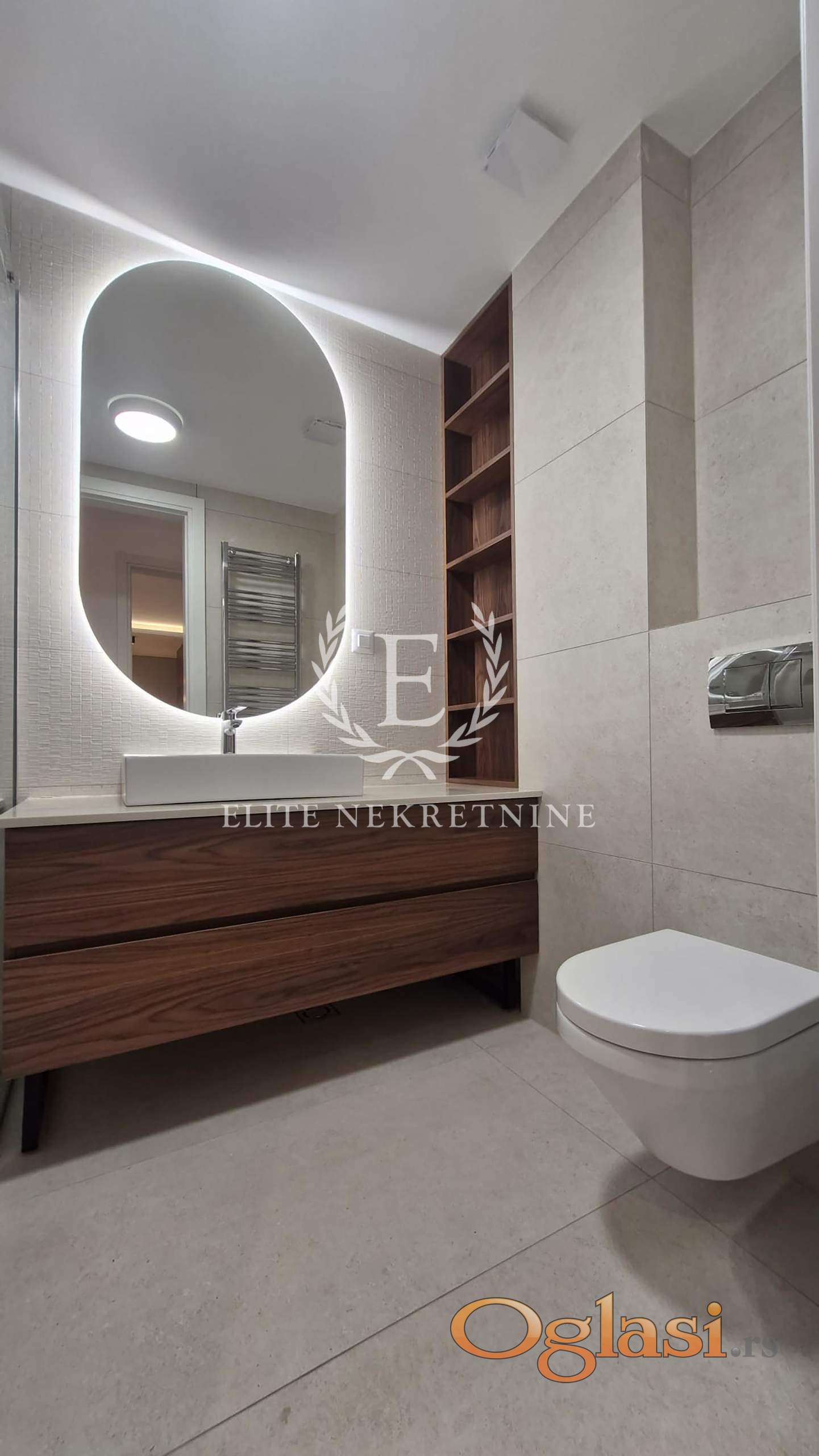 Enterijer je u potpunosti opremljen nameštajem i tehnikom visokog standarda, sa naglaskom na kvalitetne prirodne materijale, elegantne drvene tonove i sofisticirano ambijentalno osvetljenje koje doprinosi osećaju topline, komfora i savremene elegancije. Funkcionalni hodnici nude obilje prostora za odlaganje i dodatno doprinose praktičnosti stana.