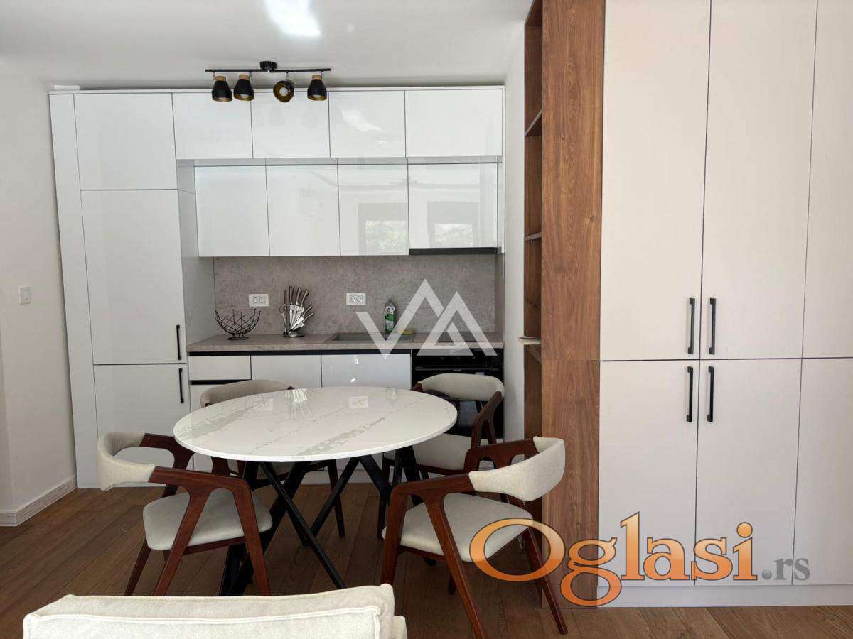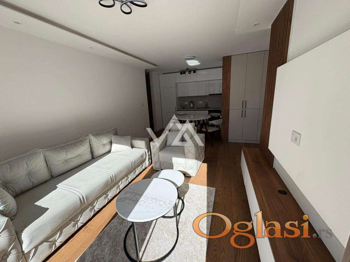 Prostor je funkcionalno organizovan i sastoji se od ulaznog hodnika, kuhinje, dnevnog boravka, spavaće sobe, kupatila i terase. Enterijer je opremljen luksuznim nameštajem, a stan je u potpunosti opremljen belom tehnikom: mašina za pranje i sušenje veša, kombinovani frižider, mašina za pranje sudova, ugradna rerna i ploča, kao i aspirator.