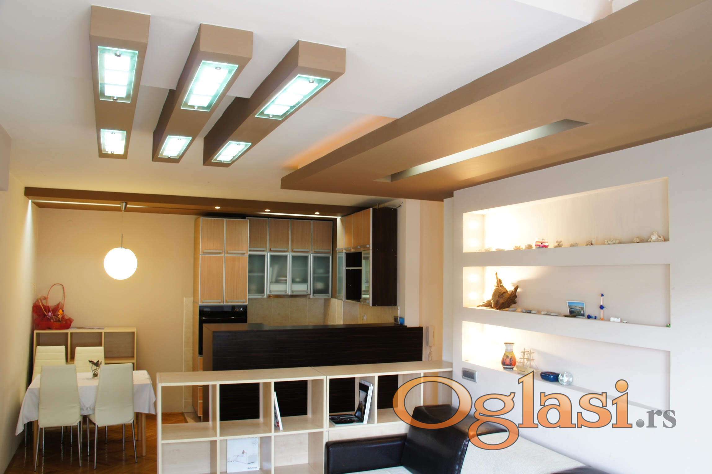 Moderno uređen enterijer sa pažljivo biranim detaljima, plafonskom i zidnom rasvetom, autorski rad arhitekte